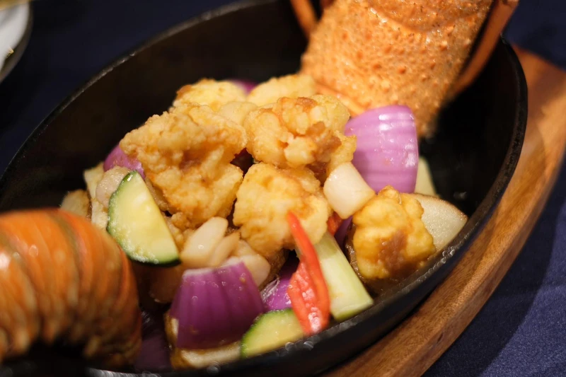 這道料理不只是口味霸道,還自帶舞台效果。新鮮龍蝦與各種時蔬大火快炒,拌入濃郁XO瑤柱醬,最後淋上橙酒點火,一瞬間火光四起,香氣爆棚。每一口都是香辣鮮美的極致享受,讓人越吃越上癮。