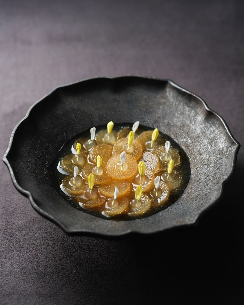 料理呈現海與陸的和諧平衡,主廚以「燒酒雞」發想,選用老母雞、金華火腿、多種藥材及米酒,無加一滴水,經6小時慢燉,凝練出濃厚純粹的湯底,並以「海」元素—鮑魚替代傳統雞肉。先以鹽麴醃漬,再以紹興酒、米酒及雞湯煨煮,增添酒香深度,鮑魚切上花刀,使口感更顯細膩柔嫩,搭配冬菇、冬筍與川七,帶出豐富層次與鮮味,以細緻的日本山藥如薄雪輕覆,為菜品增添清雅氣息。