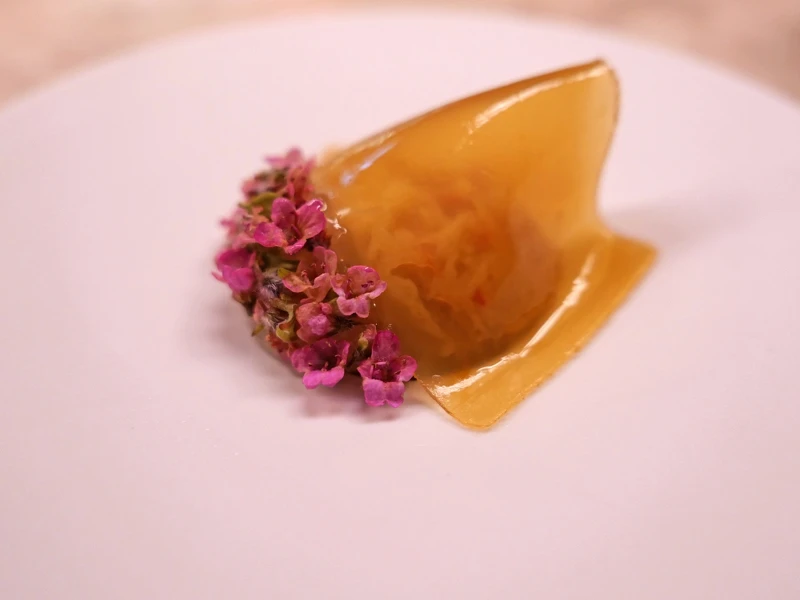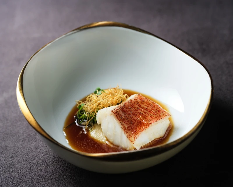 取經典湘菜「剁椒魚頭」為靈感,結合日式天婦羅與法式醬汁技法,呈現多元風味的交融,選用北海道鮫鰈搭配紫蘇葉,以天婦羅手法呈現,底部醬汁融合中法元素,法式奶油醬加入高粱酒與臘八蒜,增添深邃風味,剁椒醬是此道的亮點,以風乾紅甜椒、泡椒等中式香料熬製而成,香辣馥郁並保留湘菜的熱烈鮮香,帶來難忘的味覺體驗。