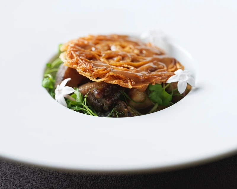 承襲華人飲食文化中「八珍」的意境,以海中珍寶「海參」為主角,海參經過7日細心泡發,以蔥燒滷汁慢火煨煮,搭配滷製至軟嫩入味的蹄膀,並特以法國甜蒜替代傳統大蔥,平衡鹹香風味,頂部覆蓋竹升麵製成的兩面黃,乾煎至金黃酥脆,淋上以雞高湯與烏醋調製的醬汁,酸香提味,鮮美回甘。