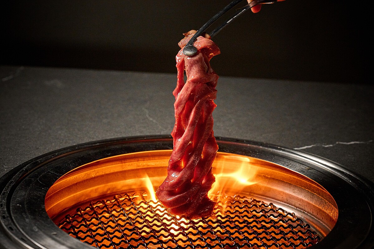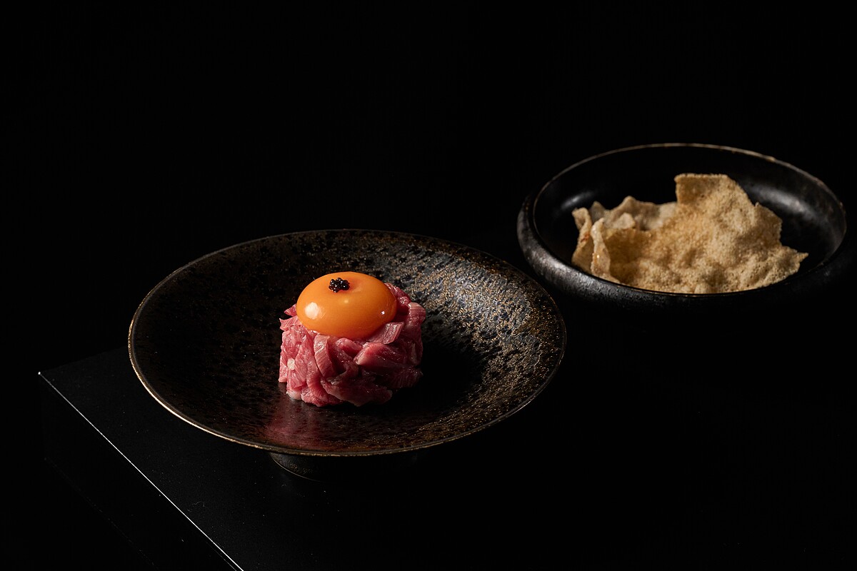 第一道正式料理是視覺與味覺兼具的和牛韃靼,選用日本A5和牛肩胛部位手切成條,拌入秘製燒肉醬,柔軟且帶有適度嚼勁。上桌後在桌邊拌入溫潤生蛋黃與魚子醬,讓整體口感更添滑順豐富,搭配的櫻花蝦餅則酥脆鹹香,與嫩口的和牛形成完美對比,一口咬下,海陸雙重美味在口中爆發,瞬間提升整場燒肉的期待感。