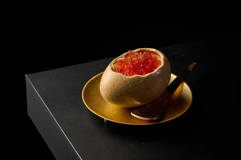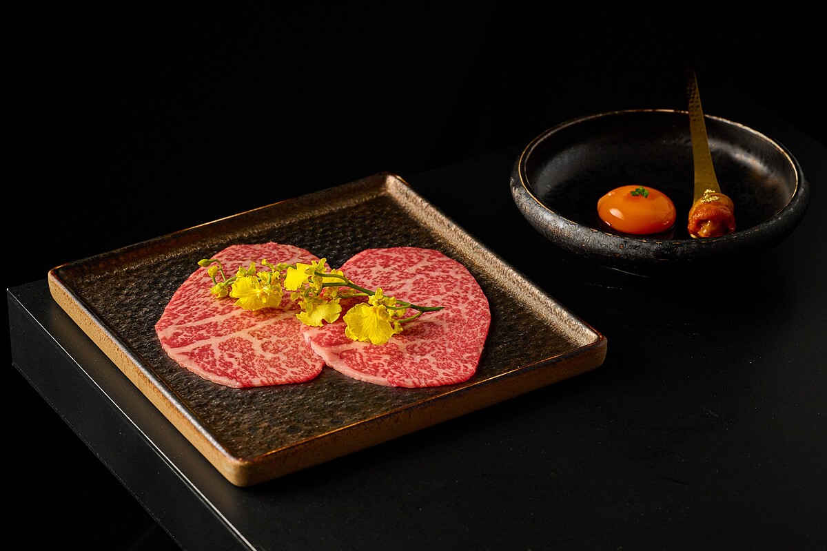 選用日本A5和牛肋眼心部位燒烤至五分熟,加入馬糞海膽與生蛋黃,讓鮮甜與濃郁感推向巔峰。和牛的細膩油脂與海膽的濃郁鮮香交織,這一口,將整場燒肉饗宴推至最高點。