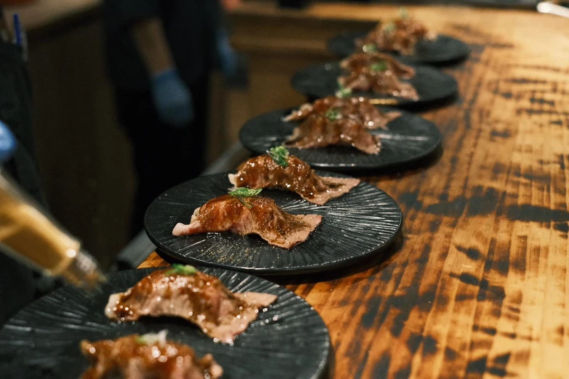 如果你點的是頂級和牛套餐,就能享受這款全新「柚香炙燒和牛壽司」。這款壽司特別以柚子胡椒取代傳統芥末,並灑上柚子粉提香,讓炙燒和牛的油脂與壽司米結合,吃起來不僅不膩,還帶有清爽果香,意外地平衡又順口。