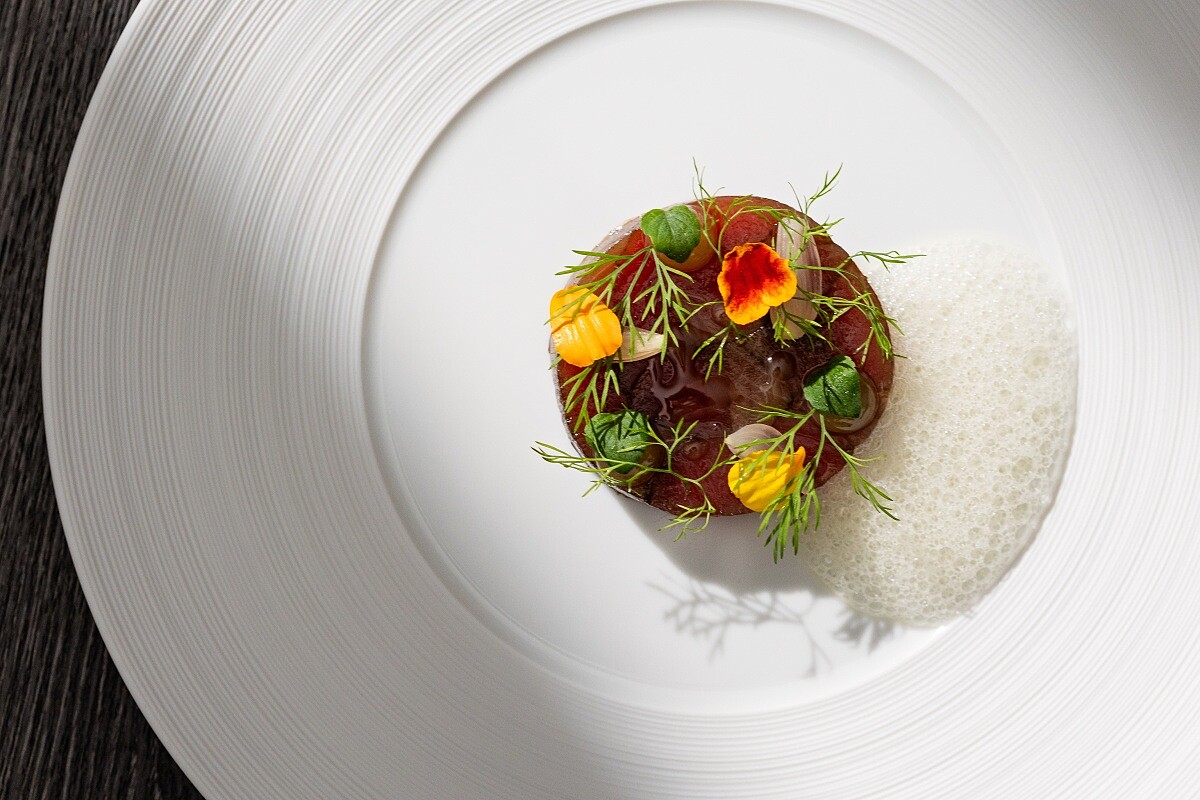 經過七日鹽漬熟成的鮪魚為主角,肉質緊實且細膩,外層覆以茴香籽粉、紫蘇粉、匈牙利紅椒粉和海苔粉,營造出大理石般的紋理。搭配清甜的紫蘇果膠與酸脆的醋漬小洋蔥,微妙的對比增添層次。茴香、接骨木花、佛手柑與檸檬調製的泡泡帶來絲滑口感,果酸讓鮪魚更加鮮活。柑橘的芳香與紫蘇的草本氣息,輕盈地與鮪魚的鮮味交融。