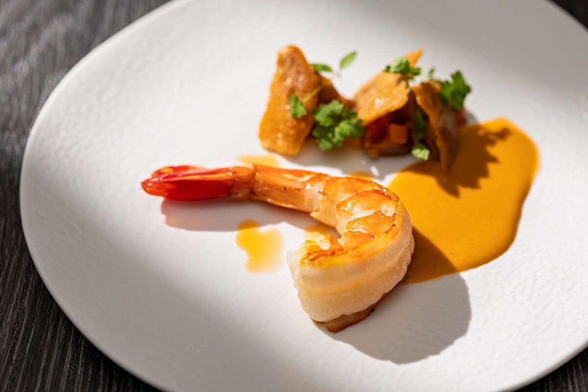 這道料理點出了香料所帶來歷史意涵,主廚選用煎香海虎蝦,搭配摩洛哥燉菜 Zaalouk,並以濃郁的櫻花蝦醬及杏仁瓦片靈感製成的櫻花蝦瓦片,營造出獨特的海味層次。摩洛哥燉菜的傳統羊肉配方,這次大膽使用海鮮,並將百合取代鷹嘴豆,保留脆嫩口感,使風味更加清甜細膩。海虎蝦的醬汁由東港日曬櫻花蝦與干邑白蘭地製作,並使用七味粉取代傳統香料,避免了與摩洛哥香料的衝突,保持辛香調性。薄脆的櫻花蝦瓦片增添酥韌口感,突顯鮮甜鹹香,打破傳統風味邊界,將全球香料巧妙融合,創造出全新的味覺共鳴。