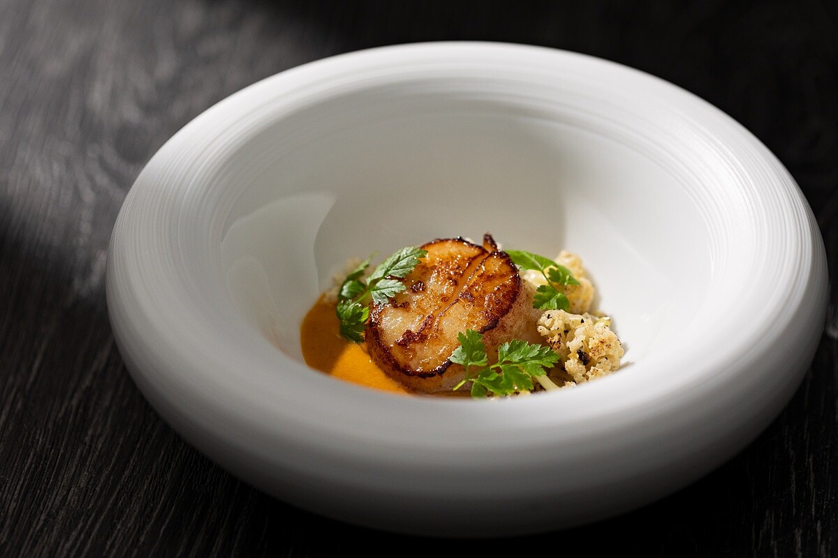 以「昔日果腹糧、今朝極珍饌」為概念,結合了絲路上的高粱米與鹽膚木,呈現出新舊風味的交融。選用香煎北海道干貝,搭配以花椰菜梗製成的奶香醬汁,並用鹽膚木增添酸味,使醬汁更具層次。海膽醬則由日本海膽、米醋、清酒和檸檬汁調和,帶出鮮美的海鮮風味。烘烤過的高粱米增添酥脆口感,與炭烤花椰尖的焦香交織,最後以山蘿蔔葉油勾畫餘韻。
