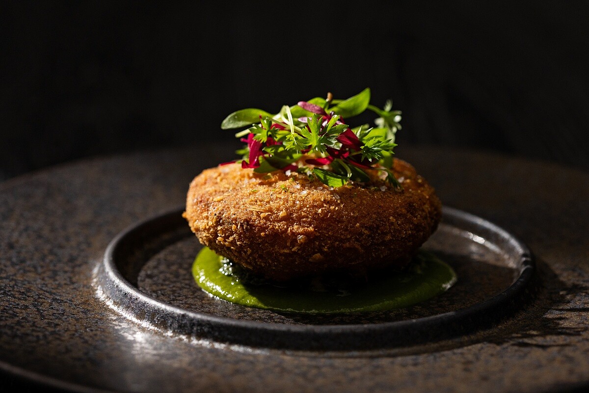 以經典的法式蟹餅佐以由酪梨、芫荽、青辣椒、萊姆汁與 Tabasco 製成的果泥,並搭配阿根廷青醬 Chimichurri,該醬料以洋蔥、芫荽、巴西里、鯷魚與白酒醋調和,去除傳統的果酸元素,並以酪梨的潤澤感增添草本香氣。番茄油由新鮮番茄與日曬番茄乾製成,為料理增添酸甜和深層風味,使整道菜呈現平衡且鮮活的層次。