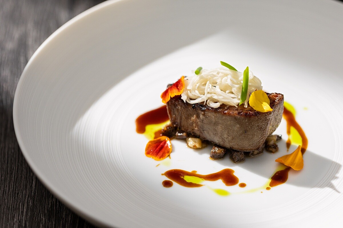 然而,對「A Cut」團隊而言,尋找優質食材一直是核心任務。凌維廉特別強調:「我們不僅要求品質穩定,還必須符合餐廳對風味的獨特需求。」尤其是關鍵主菜—「牛肉」,他表示選擇牛肉時不僅考慮產地與品種,更關注飼養方式與肉質表現,以確保每道菜的卓越水準。去年,他多次出國考察,持續探索新的肉品及料理技術,只為帶給食客前所未有的味覺體驗。2025年初,「A CUT」引進了來自澳洲銅樹農場的獨家熟齡荷斯登老乳牛,並選用經過50天乾式熟成的帶骨紐約克,使牛肉呈現出豐富的層次感。