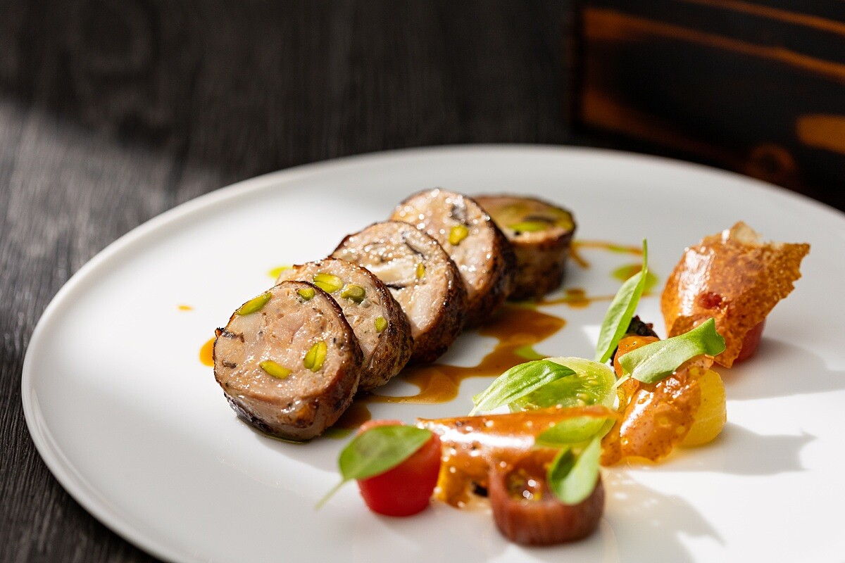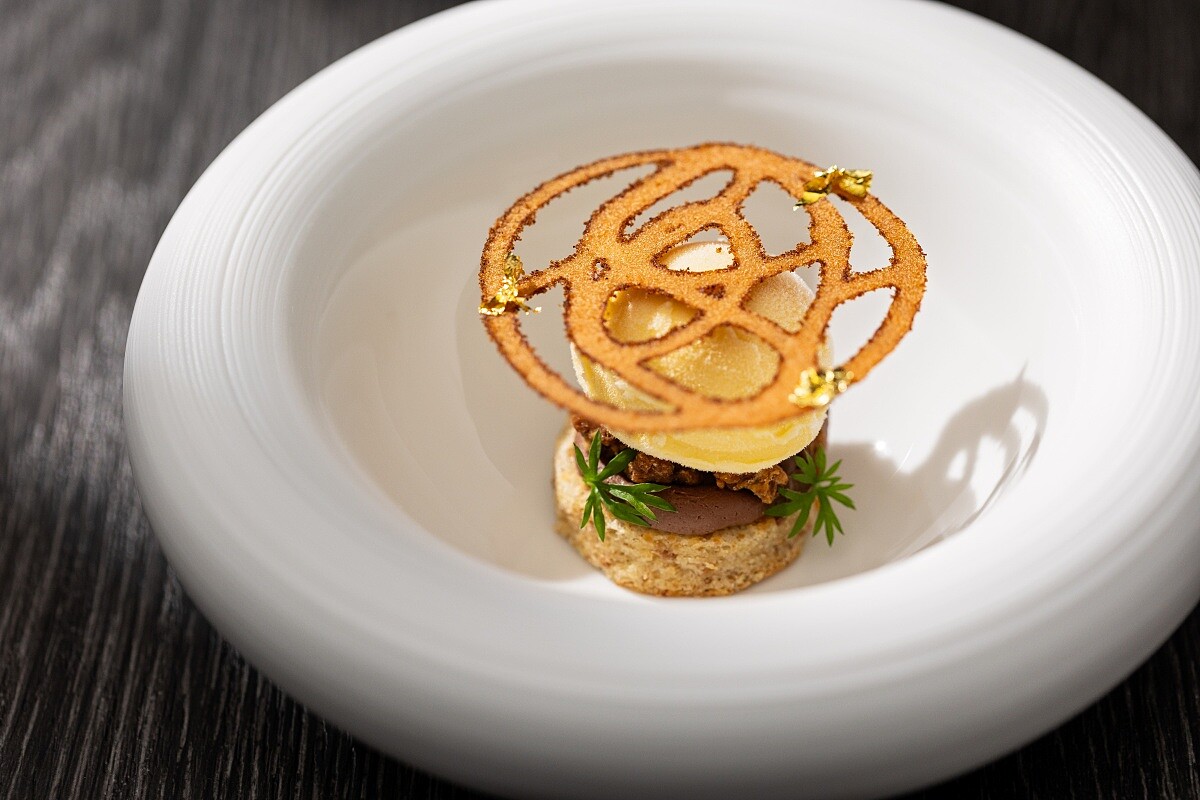 融合法國貴族肉派與清朝八寶鴨的元素,展現東西方御膳的傳承與創新。雞腿去骨後填入雞肉慕斯、野菇、金黃葡萄乾與開心果,經干邑醃製並低溫蒸製、懸吊風乾,最後香煎與炭火燻烤,使外皮酥脆、內餡多汁。醬汁由客家桔醬、干蔥和多蜜醬調製,搭配風乾番茄泥與油封鮮番茄增添酸甜層次。雞皮與雞湯製成薄脆,釋放濃郁雞脂香氣。