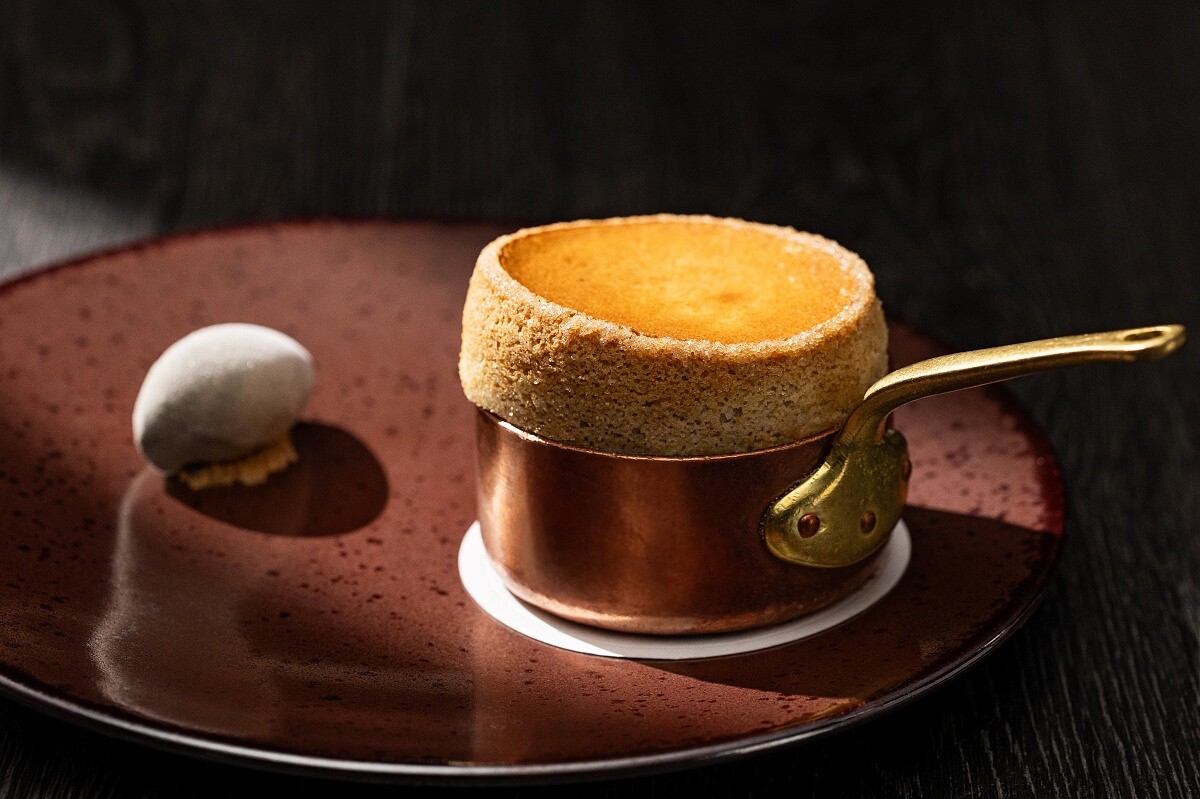 舒芙蕾一直是「A Cut」的招牌甜點,每季都會更換全新口味,開業至今可能已有數十種。甜點主廚以保有紅豆皮的紅豆餡製作舒芙蕾,搭配濃郁的黑芝麻冰淇淋,呈現紅豆餅的經典風味。熱騰騰的舒芙蕾與冰淇淋的對比,交織紅豆的甜香與黑芝麻的醇厚,喚起對街頭紅豆餅的溫暖回憶。