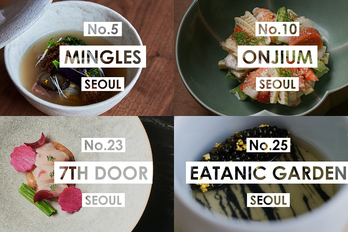今年最主辦城市首爾入圍餐廳來到4間,以融入港式與歐陸風味的創意時令韓國料理而著稱的「Mingles」獲得最佳成績第5名,同時也得到「大韓航空」(Korean Air)贊助的「韓國最佳餐廳獎」(The Best Restaurant in South Korea)。主廚姜珉求(Mingoo Kang)在簡約素雅的空間中,完美展現本土獨特食材之魅力。「Onjium」名次大躍進攀升11位獲得第10名,另外還有位居第23名的「7th Door」,首度登榜的第25名「Eatanic Garden」,同時獲 Lavazza 冠名的「最佳新上榜餐廳獎」(Highest New Entry Award)。