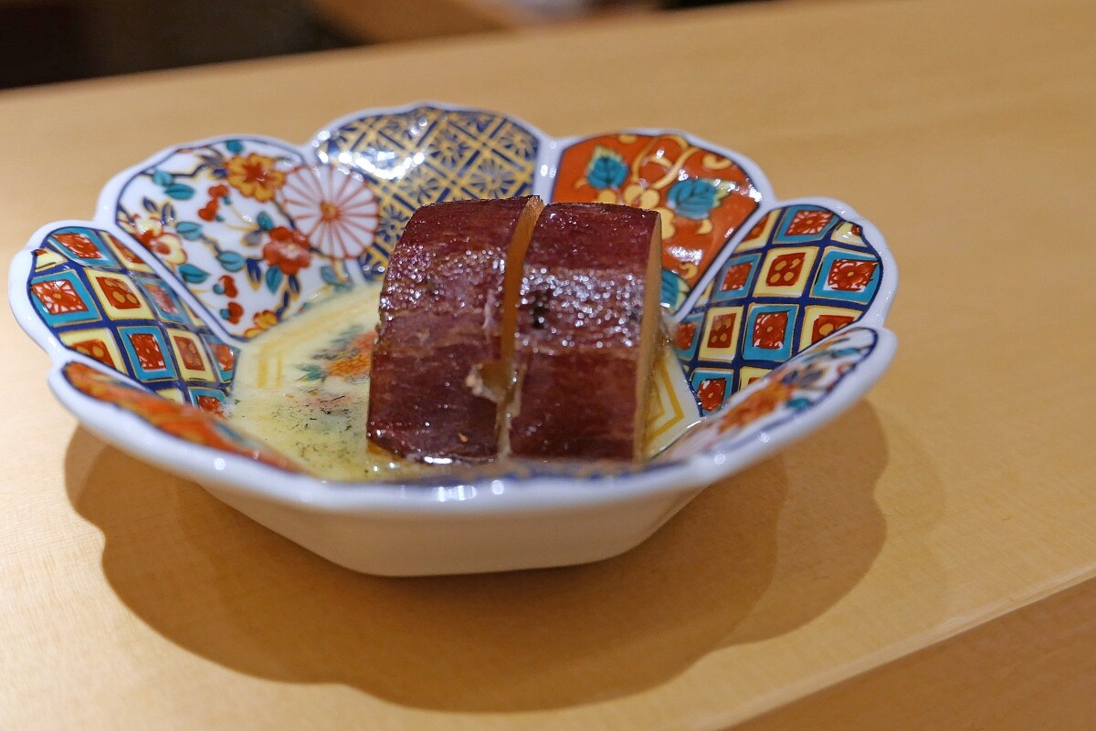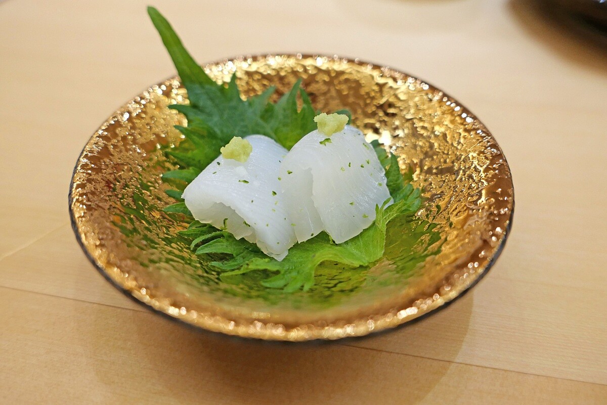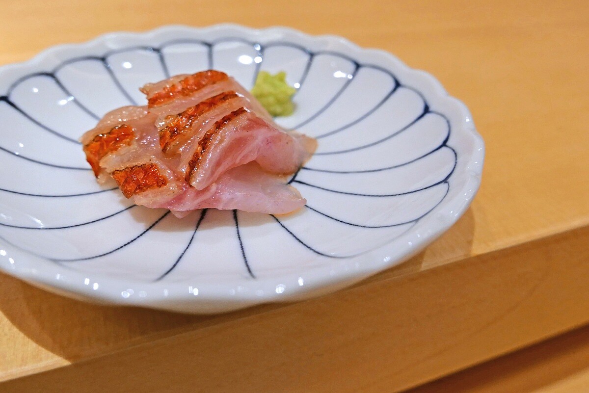 金目鯛依等級區分為地金目、島金目和沖金目。料理長選用最頂級的地金目為食材,切成薄片上桌,入口甘甜,油脂細膩。