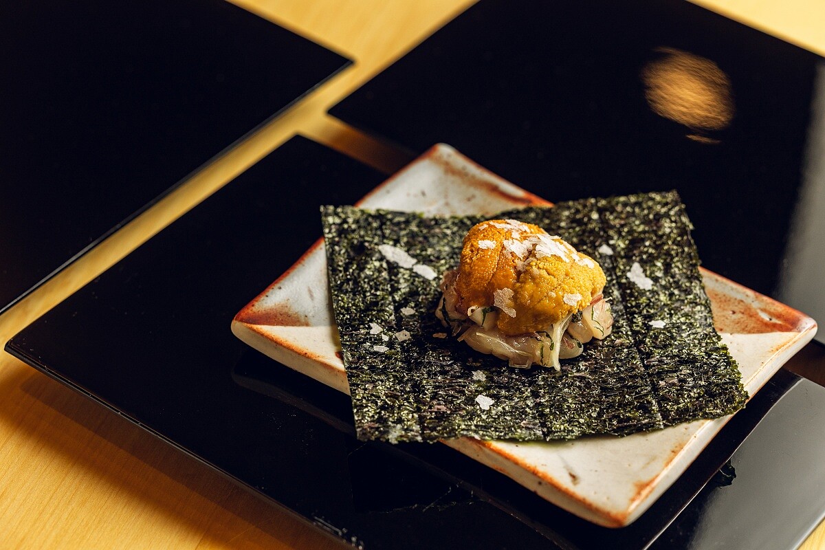 將生雞胸肉先以昆布漬的手法處理,再切成易入口的雞肉細條,以現烤的丸山海苔為底,並鋪上北海道海膽,讓割烹與燒鳥的界線逐漸模糊,並讓賓客感受雞肉與海鮮搭配的雙重滋味,達到銜接食材風格轉換的妙效。