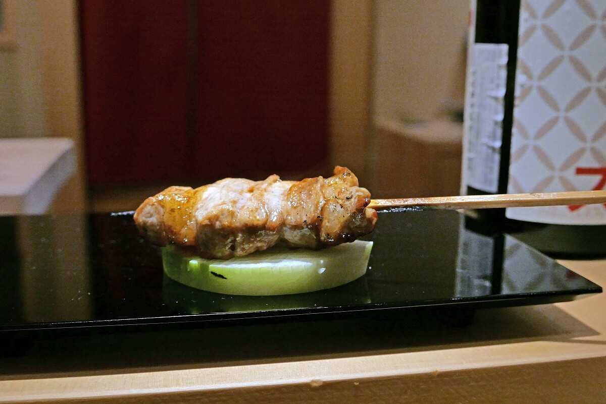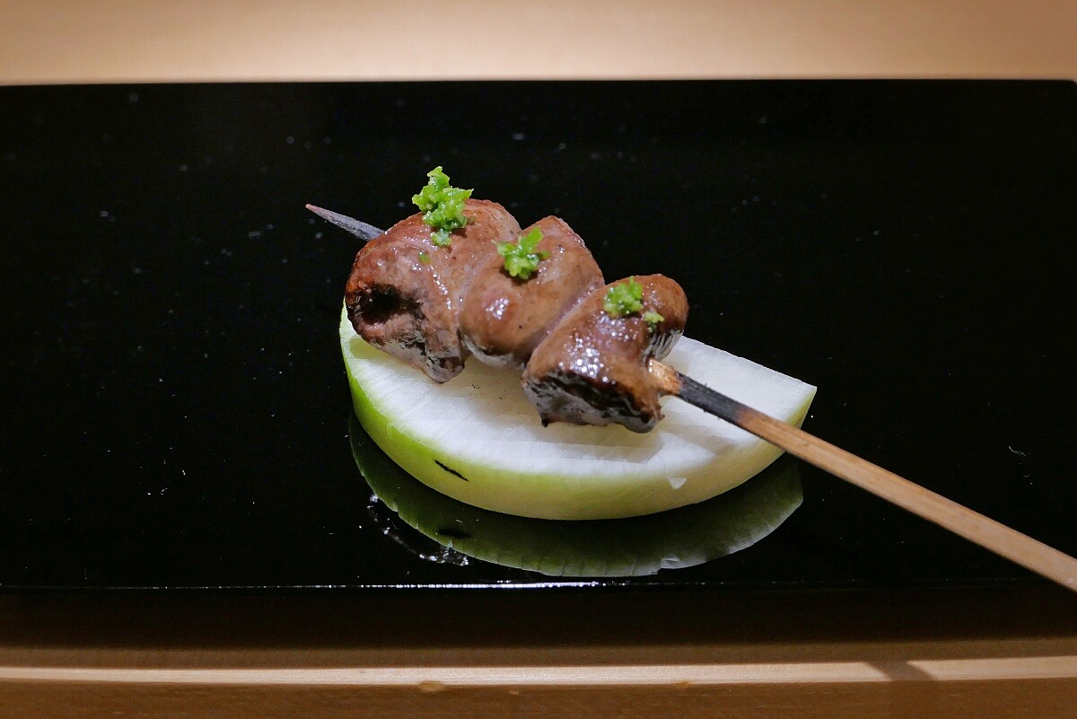 透過精湛刀工與串籤的細微調整,完整保留里肌部位的軟嫩口感,燒烤至3-5分的半熟狀態上桌,並以靜岡山葵提味。看似簡單,背後是料理長對於食材的充沛理解與控火能力。