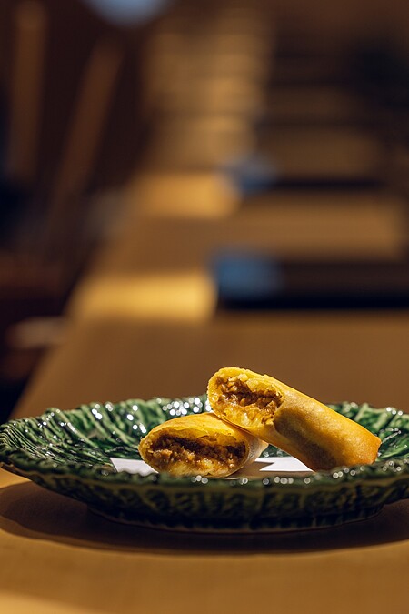 先將不適合製成串燒的雞小腿部位製成絞肉,搭配咖哩、豆瓣等元素製成和風咖哩醬。再將咖哩醬連同起司,共同包裹於添加雞蛋的特製春捲餅皮內,油炸至金黃上桌,四溢香氣不斷刺激味蕾。
