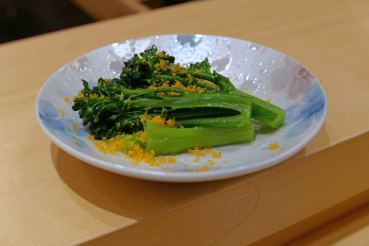 冬末到早春產的青花筍,添加雞油後於烤檯上翻炒。藉由邊燻邊炒的手法,讓青花筍擁有誘人又粗礦的炭香,更能顯現青花筍本身的清新甘甜。