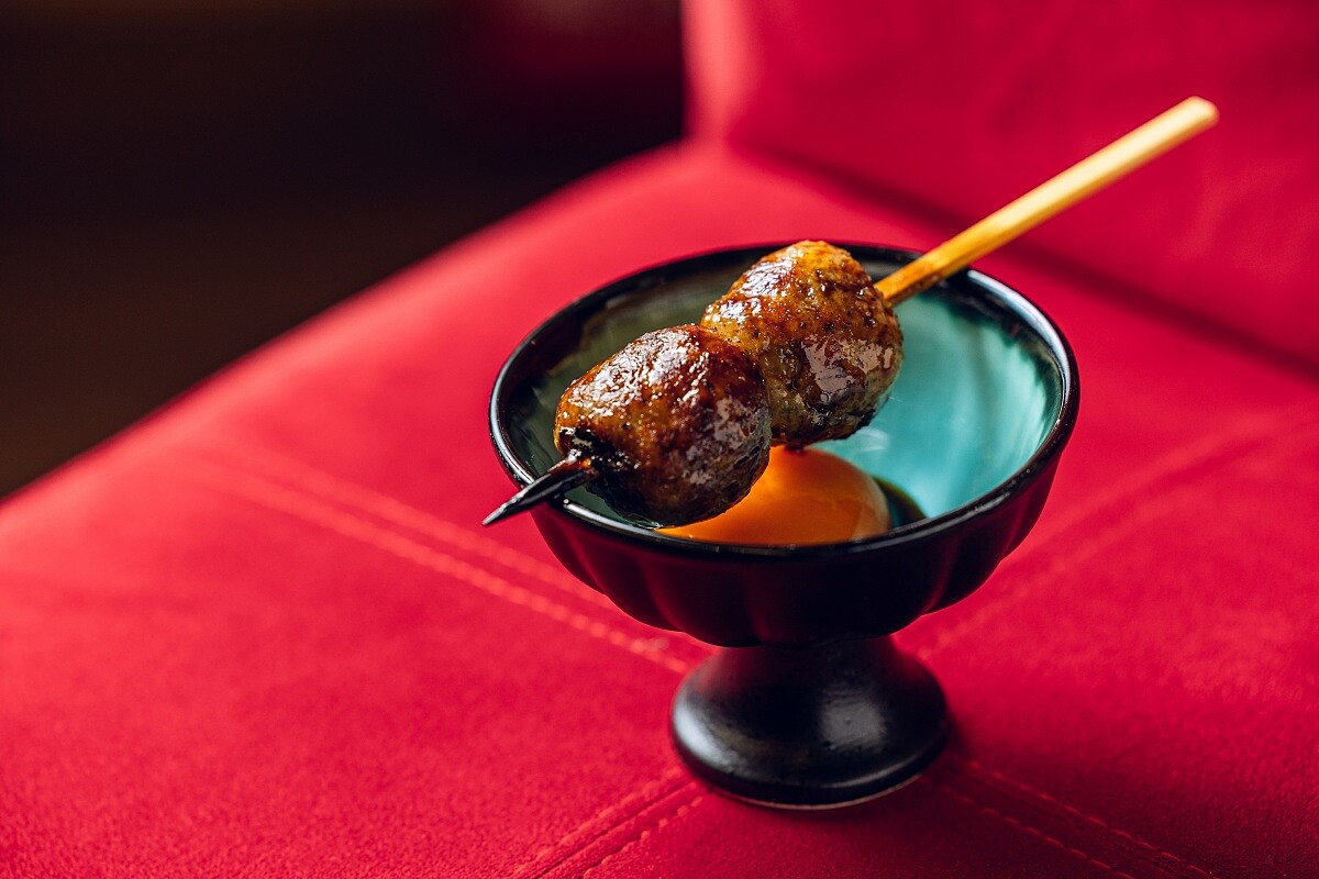 取雞小腿部位自製成新鮮絞肉,再添加日本大蔥、雞軟骨丁提昇口感變化,燒烤後口感鬆軟溼潤,搭配專為雞肉丸設計的獨門醬汁,賦予香甜清爽的馥郁鹹香,搭配無用藥、無抗生素的彰化小農土雞蛋蛋黃,更添滑順濃郁。