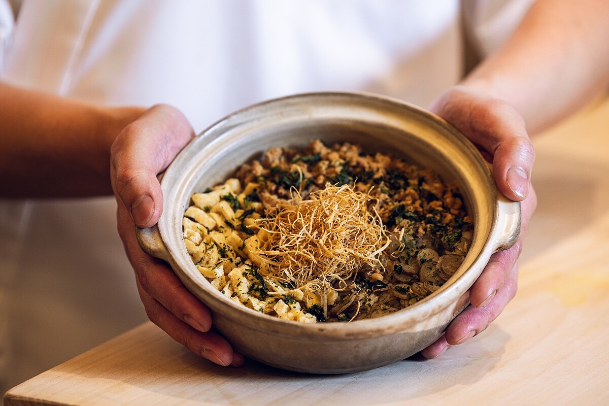 選用甜度足、不過黏的日本山形豔姬米,並且添加柴魚高湯、牛蒡湯汁共同熬煮,讓米粒富有牛蒡清香。同時添加油揚、海苔、炸牛蒡絲、牛蒡片,以及取雞小腿部位炒製而成的雞鬆,帶來樸實又令人愉悅的鄉土情調,值得細細品嚐。