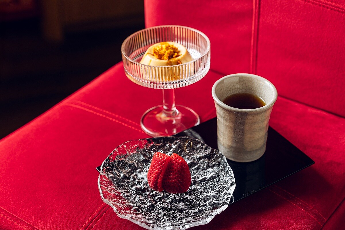 以在地鮮乳搭配彰化小農土雞蛋、馬達加斯加香草籽製成的軟嫩布丁,搭佐自製的椪糖,香醇討喜,搭配花蓮瑞穗舞鶴村的「頂級蜜香紅茶」,以清新茶韻為喉間解膩留香,也替套餐劃下甜蜜句點。