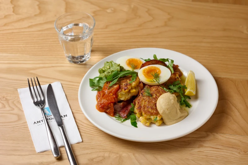 Corn Fritters 玉米餅是澳洲咖啡館裡常見的經典主食,質地蓬鬆柔軟,帶著淡淡的玉米甜香,是 Brendan Pang 和 The Antipodean 都很喜歡的一道料理,也希望能把這份熟悉的味道帶到台灣。 在這次的記者會上,Brendan 特別親自示範這道玉米餅的做法。他提到,好吃的關鍵在於讓玉米餅吃起來既鬆軟又有濃郁的玉米香氣,這就需要在麵糊和玉米的比例上拿捏得剛剛好,才能做出風味平衡、口感輕盈的完美版本。 這道玉米餅搭配的配料也很豐富:有香煎培根、溏心蛋、芝麻葉、酪梨和鷹嘴豆泥,再淋上酸甜開胃的番茄洋蔥醬,每一口都能吃到不同的層次。無論是想吃得滿足,還是注重健康,這道料理都能一次滿足。