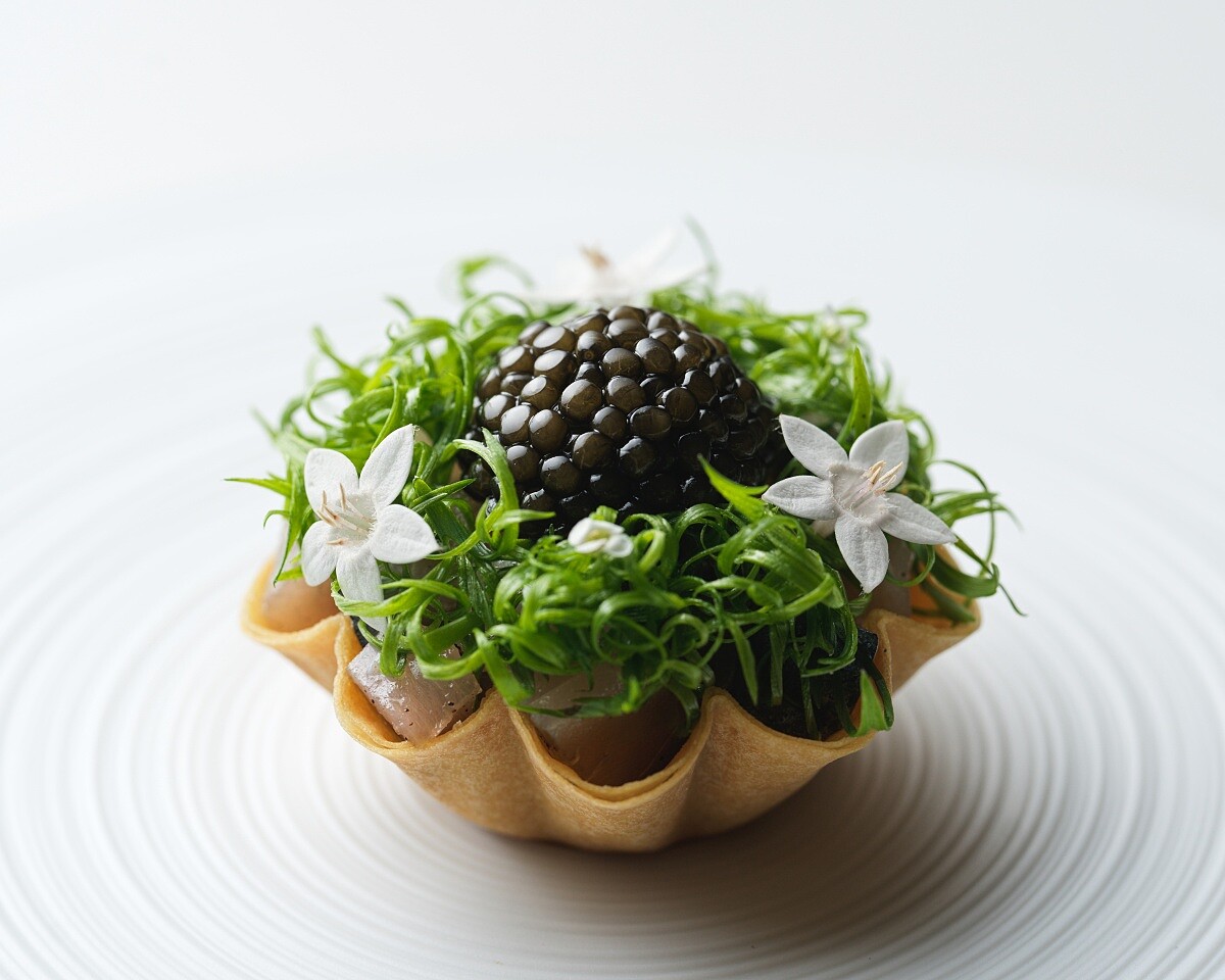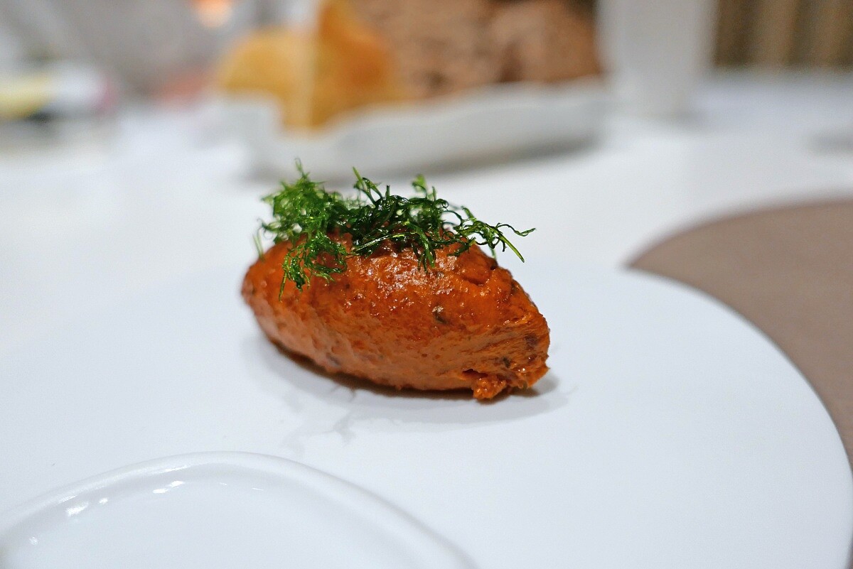 以義大利經典料理煙燻鯖魚(Aringa affumicato)作為序曲,Chef Iacopo 以自製塔殼鋪上日本煙燻鯖魚,搭佐發酵番茄醬汁並融合羅勒康普茶凍的草本香氣與微酸韻味,帶來清新而深刻的平衡,上方綴以魚子醬與蝦夷蔥,優雅鹹香。