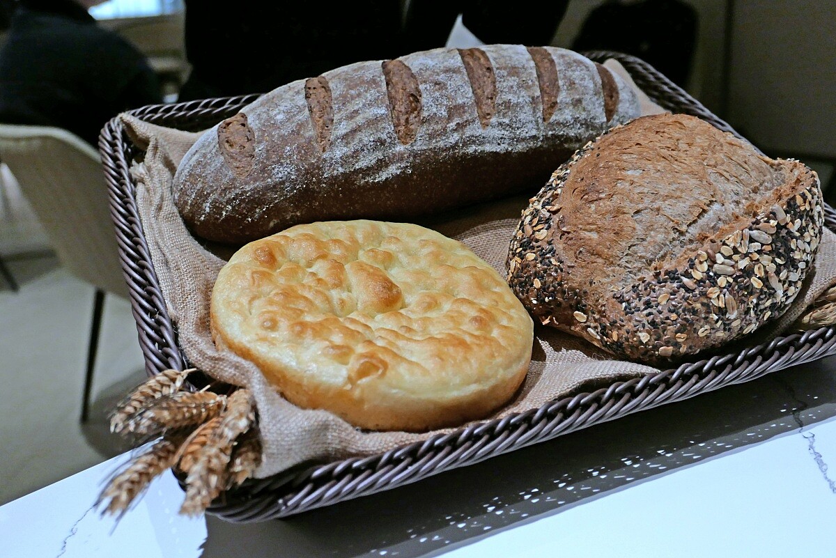 義式麵包是主廚傳遞家鄉味的代表之一,本季套餐中的三款麵包皆由主廚每日堅持手工製作,包括傳統風味的「佛卡夏」,柔軟中帶有微酥的口感;以義大利酵頭 Biga 製作的「酸種麵包」,Biga專用於義大利麵包,使麵團質地呈現美麗的氣孔,口感與風味更佳,除加入向日葵籽外,還特別加入黑芝麻、亞麻籽與黃金亞麻籽等四種種子,增添豐富的香氣與口感;以及深沉濃郁的「黑啤酒麵包」,同樣以 Biga 發酵,並使用黑啤酒取代水揉製,帶有迷人的啤酒苦香,風味獨特。