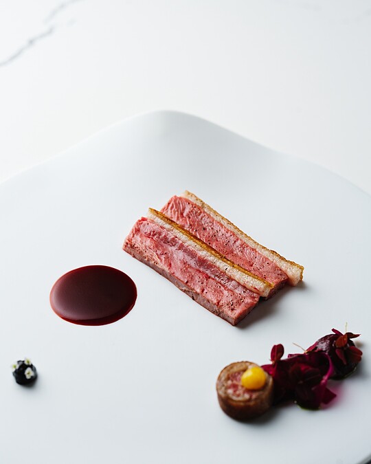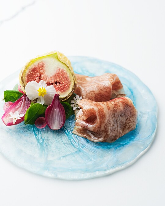 料理的靈感為羅馬經典的無花果火腿披薩,以義式火腿(Prosciutto)創新詮釋,選用日本黑毛和牛紐約客以熟成3個月製作冷肉,搭配以牛奶、鮮奶油與白酒醋純手工自製的瑞可塔起司(Ricotta),綿密清爽,平衡了和牛的濃郁滋味,並配上酥炸無花果增添果香與脆口口感,綴以12 年的巴薩米克醋,充滿細膩的酸甜韻味與和諧平衡。