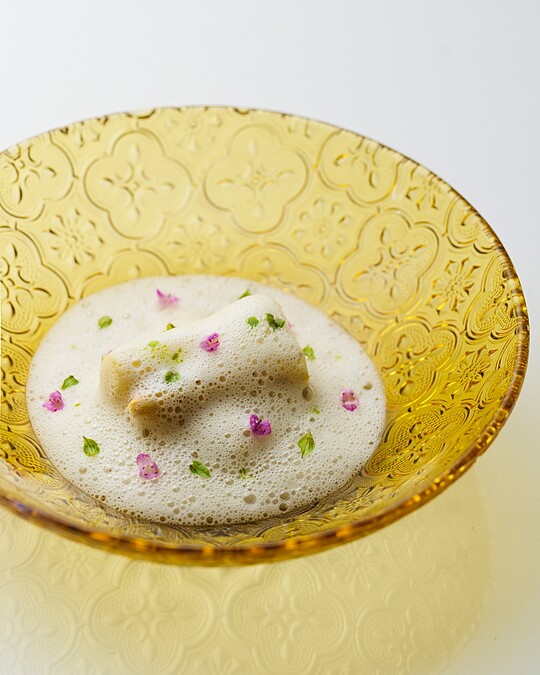 選用當季白蘆筍,碳烤後釋放自然香氣,搭配發酵白蘆筍水與奶油調製的濃郁醬汁,鋪上獨特的麥麴泡泡,是經兩次發酵,融合奶油打發,入口帶有強烈的發酵氣味,透過歐芹油點綴引出清新的氣息。