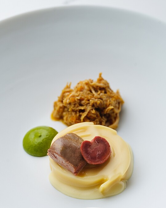 為托斯卡尼的經典意大利,以牛骨隨與奶油慢燉製成濃醇牛骨隨醬,淋於手工寬扁麵上,而麵體也捲成牛骨髓的形狀。一旁佐上的是兔肉醬,使用橄欖與海鹽調味,上頭並擺上內臟並以羅勒與芝麻葉調製的義式青醬(Salsa Verde)點綴,平衡濃郁滋味,帶領饕客認識主廚的家鄉的純粹滋味。