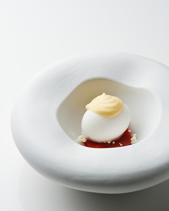 前甜點為酒釀雪酪(Sorbet),相較於傳統義式冰淇淋(Gelato)更加清爽,淋上的是酸甜草莓與濃郁的沙巴雍醬(Sabayon),沙巴雍的義大利文又稱「Zabaione」,如卡士達醬滑順細膩的質地,且帶有微醺的酒香味,撒上桂花蜜香氣的米香,成為一道輕盈優雅的甜點。