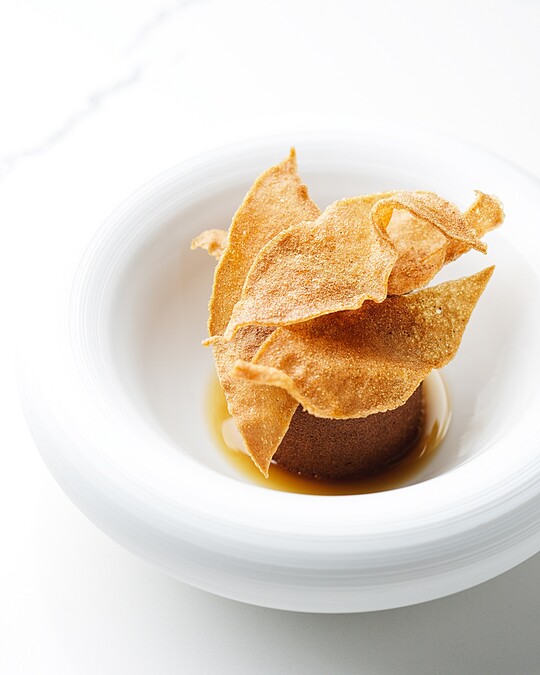 主甜點以巧克力脆片覆蓋清爽微醺的咖啡康普茶冰糕作為基底,層層搭配馬斯卡彭鮮奶油的細膩柔滑、醃漬義大利橄欖的鹹香微酸,並融合牛肝菌慕斯與牛肝菌的巴薩米克醋,為甜點注入森林氣息與味覺層次,淋上黑麥蘋果醬,增添果香與微甜的風味。