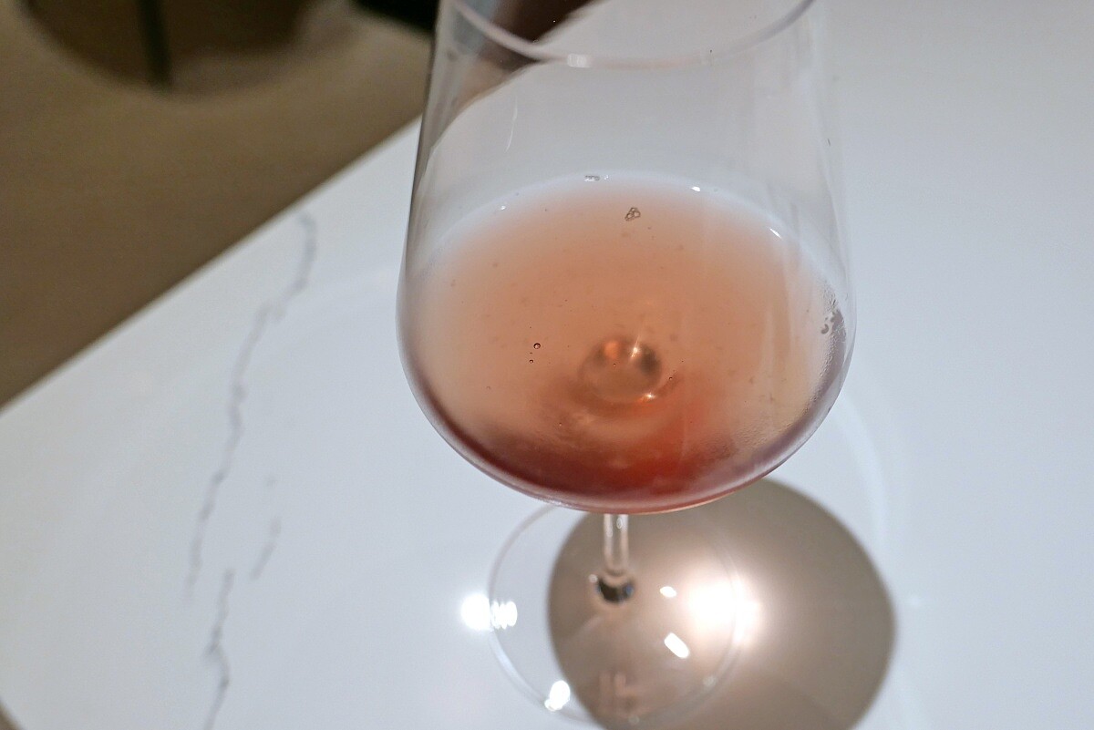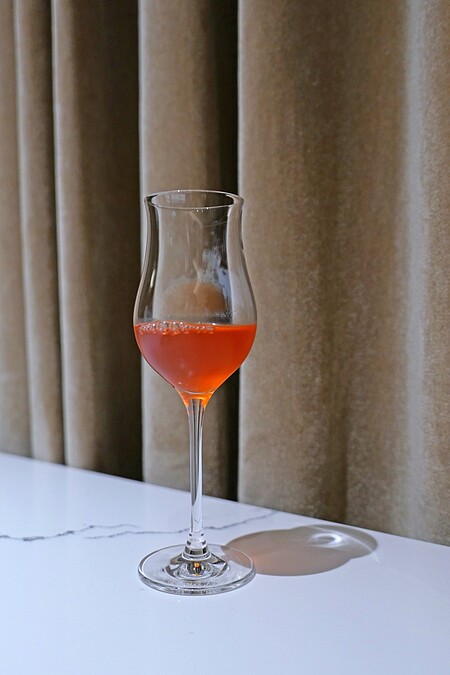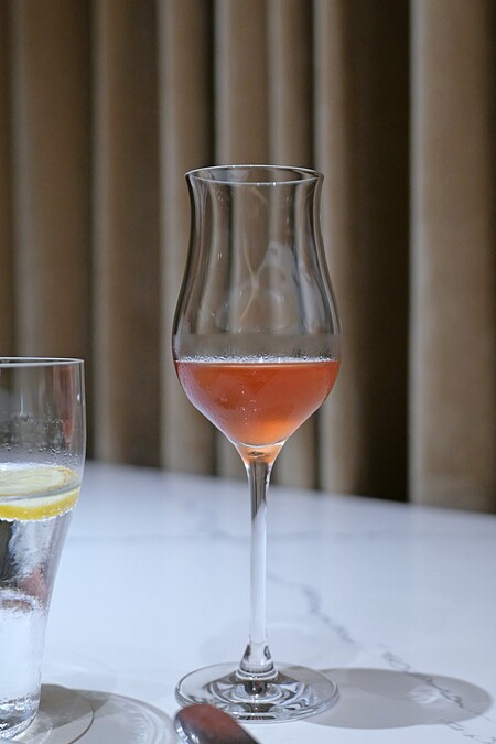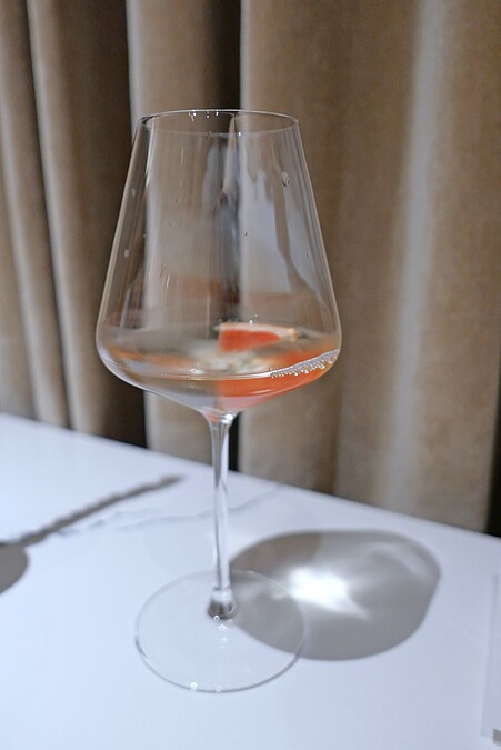 開胃飲品是主廚特別為第一道開胃小點所設計的搭配,概念有點像是「Dirty Martini」。使用壽司米進行發酵,製作成米麴,然後搭配橄欖汁,最後在飲品上滴上佛羅倫斯的春榨橄欖油。 這杯飲品可以在享用開胃小點前先喝一口,幫助開啟味蕾。