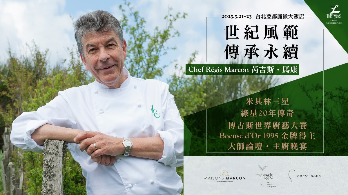2025年5月21日至23日,「巴黎廳1930 x 高山英紀」將迎來一場前所未有的國際級盛事。芮吉斯・馬康將首度親赴台灣,與愛徒高山英紀聯手獻藝,帶來三場限量師徒傳承饗宴,以及一場公開大師論壇。馬康主廚將親自呈現他最具代表性的山野料理,以鍾愛的野生蕈菇、香草與當地食材為核心,展現他如何以料理對話自然,回應永續。他將重現那些讓米其林、「Bocuse d’Or」折服的料理,並與高山英紀主廚一同詮釋風土如何跨越國界,轉化為全新語彙。而在大師論壇中,他將分享自己對法國料理未來的見解、對教育的熱情,以及 Fine Dining 如何在創新與永續之間找到新的定位。