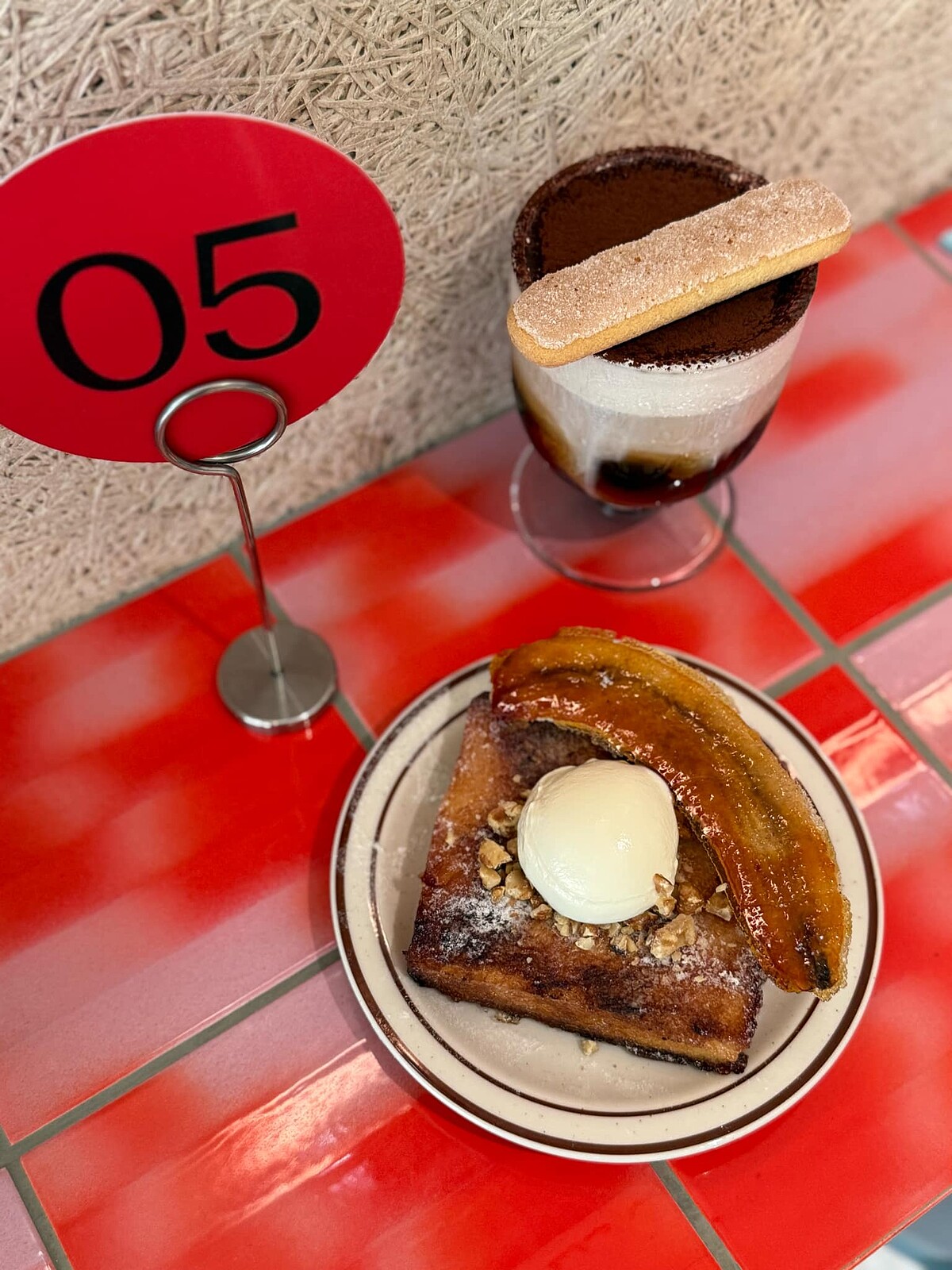「Local Local 中⼭」店內最顯眼的絕對是串連室內外空間的電線桿裝置,上頭則可以讓各位貼紙條留言,成了俏皮的打卡區,另外除了使⽤荷蘭設計師磁磚品牌Palet打造紅色磁磚長桌,還有法國藝術家Ana Popescu的兩幅畫作增添解構幾何審美,每一處都充滿細節。