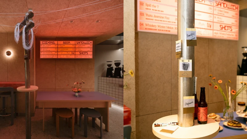 「Local Local 中⼭」店內最顯眼的絕對是串連室內外空間的電線桿裝置,上頭則可以讓各位貼紙條留言,成了俏皮的打卡區,另外除了使⽤荷蘭設計師磁磚品牌Palet打造紅色磁磚長桌,還有法國藝術家Ana Popescu的兩幅畫作增添解構幾何審美,每一處都充滿細節。