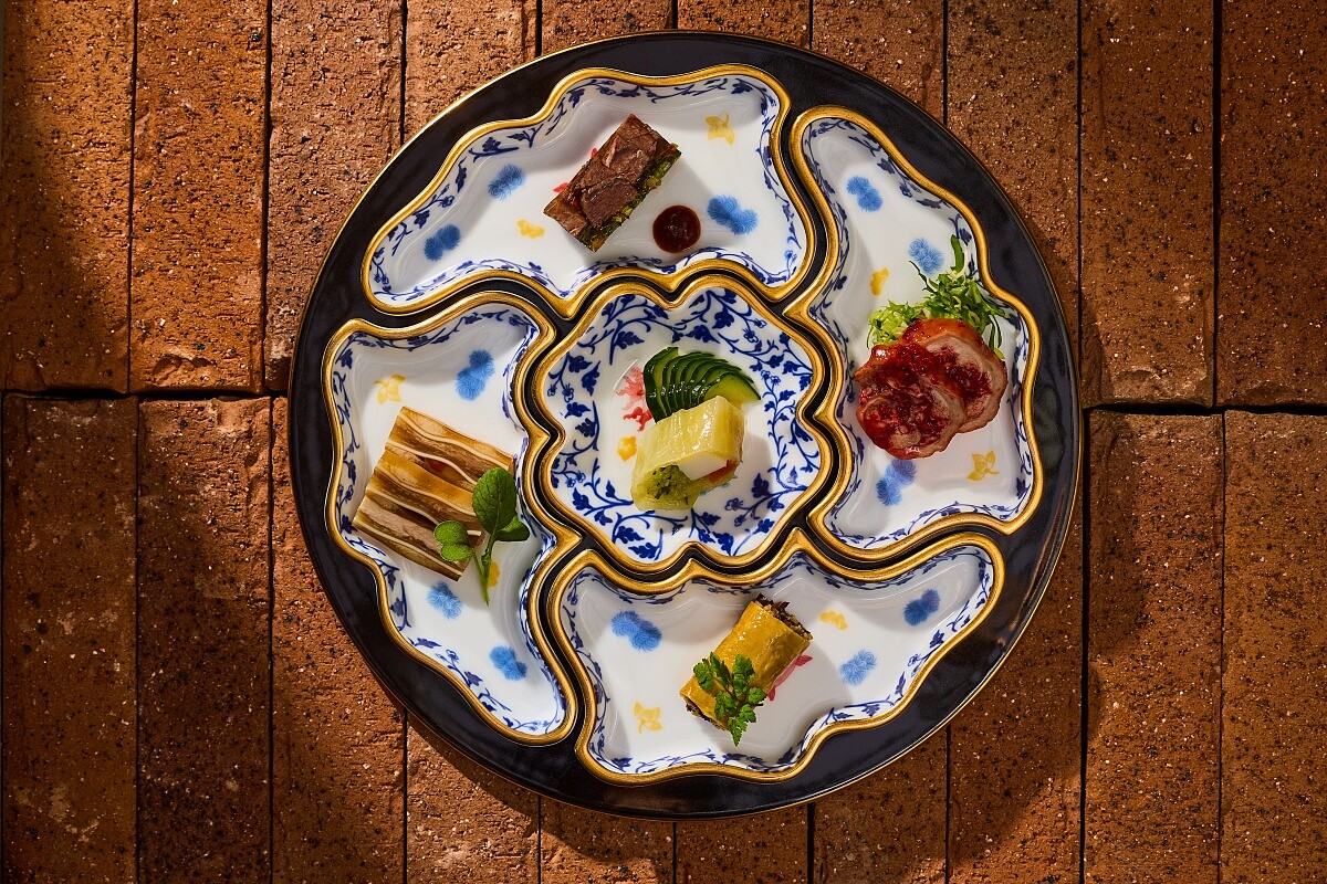 「泡菜軟絲卷」要先將高麗菜川燙後,以白醋、糖、香油醃漬,將入味的高麗菜捲入小黃瓜絲、紅甜椒條、薑絲、軟絲條後切片呈盤。「夾心松阪豬」以台灣本味為靈感,先將松阪肉、豬耳朵分別滷製,滷汁膠質交疊成凍切片,搭配油潑辣子與醬油膏調製沾醬,口感帶有豬耳朵脆嫩並富有嚼勁。發想源自牛肉麵的「紅燒牛肉凍」則以蔥、薑、八角與和牛頰燉煮放涼成凍,淋上麻辣醬、醬油膏與蒜末製成之醬汁,風味飽滿討喜。