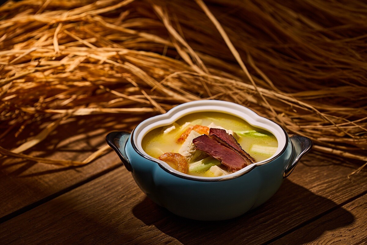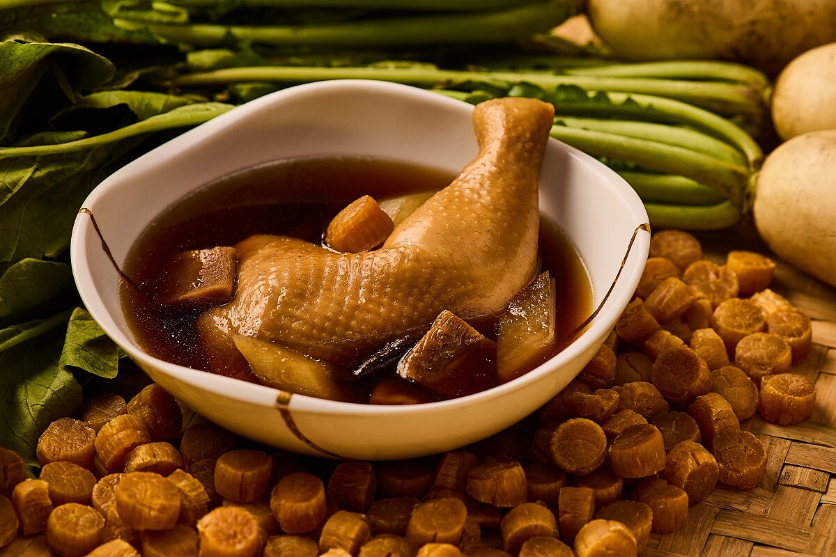 選用來自桃園龍潭的陳年老菜脯與老母雞以水蒸煮過濾,再將台灣特有的仿土雞腿肉與干貝、黑蒜頭以及新鮮白蘿蔔、3年與10年菜脯同雞高湯燉煮1小時,湯頭中有著新鮮蘿蔔與老菜脯(俗稱黑蘿蔔乾)甘美尾韻,風土滋味悠遊。