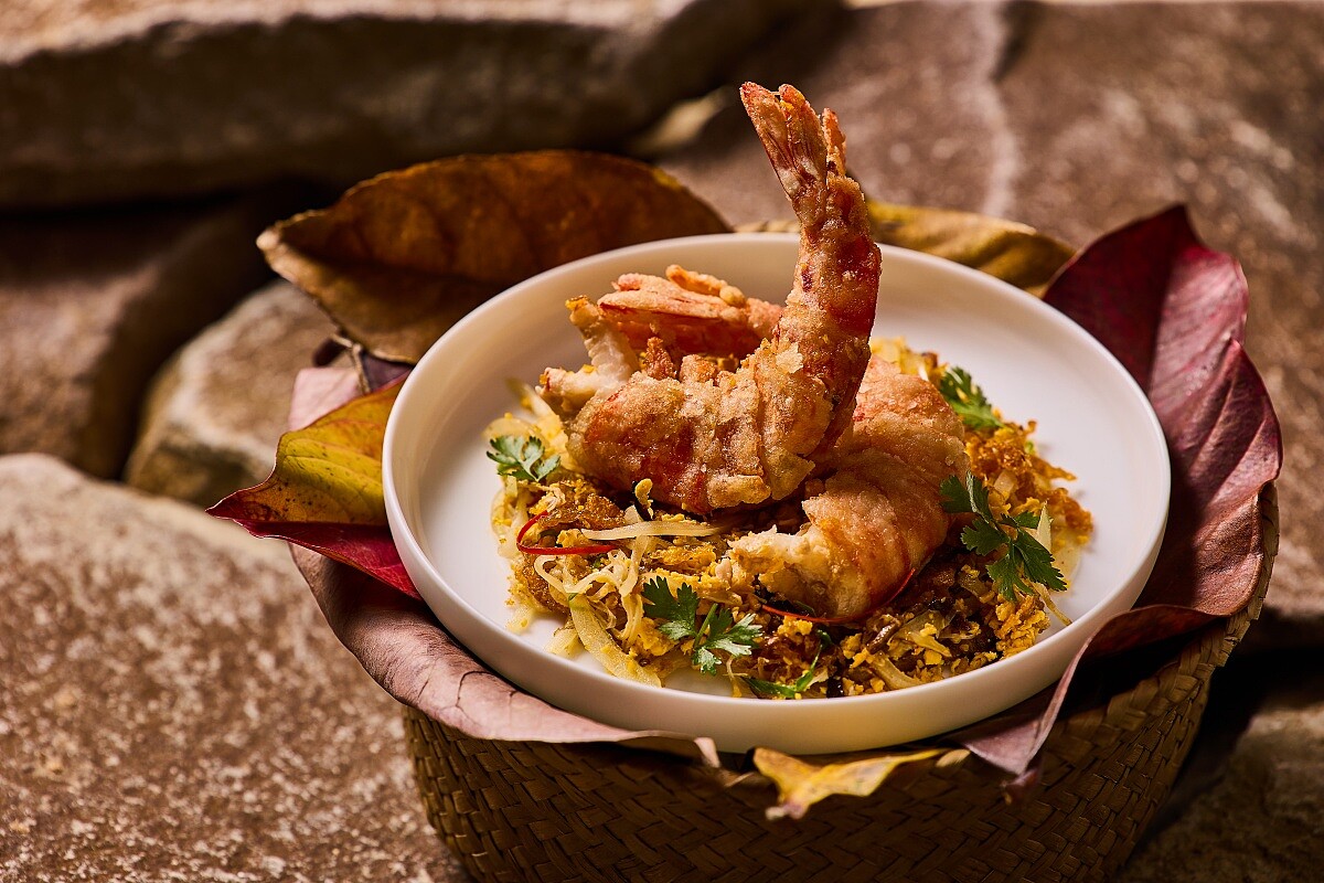 展現絕妙的火候與炒功,「炒桂花」是江浙一帶將雞蛋炒得濕潤如桂花狀,這道菜先將鴨蛋炒成油亮香鬆如桂花,明蝦起鍋前再將洋蔥、筍絲、香菇絲與桂花拌炒,蛋香濃郁,鹹鮮交融。