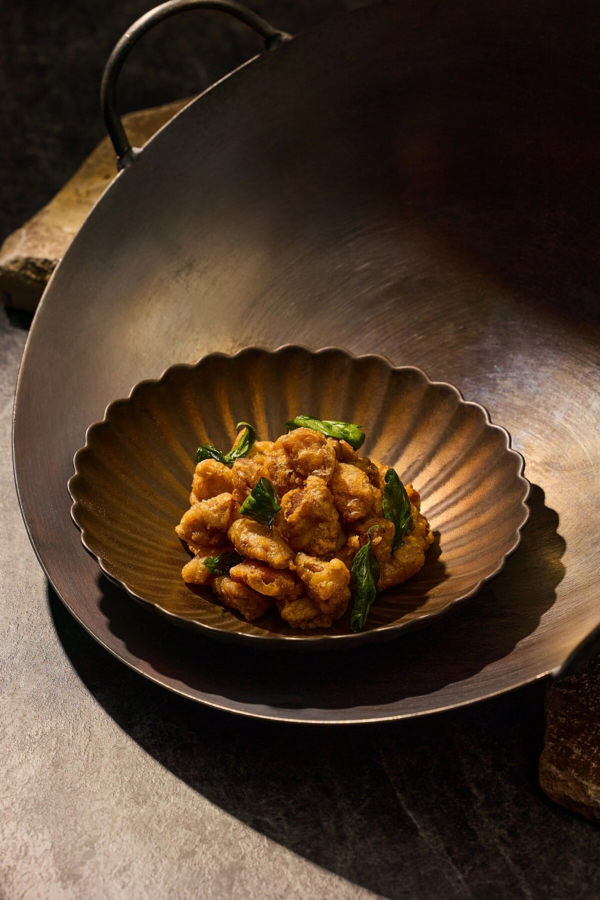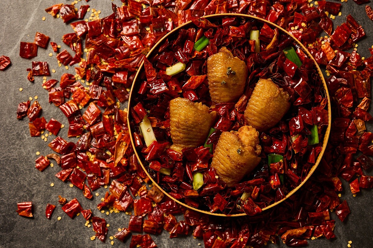 採粵式鑲餡手法,先將二節翅去骨填入花枝與蝦漿蒸製鎖住鮮味,再以花椒油與花椒粒、乾辣椒、辣油等炒香,外酥內嫩、鮮香麻辣。