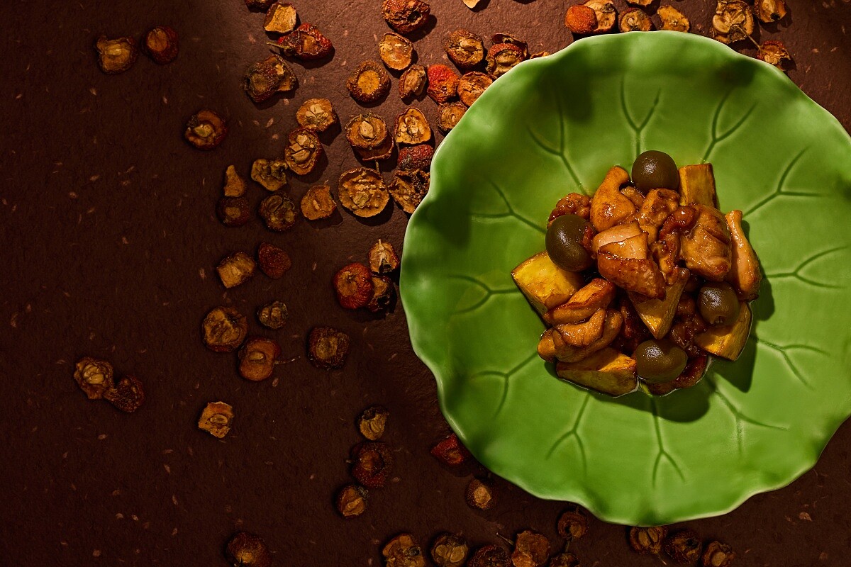 在上一版的以「椒麻」風味的菜色使用的是「田雞腿」來製作,此次則以雞翅作為主題,再加上粵式鑲餡手法呈現。主廚表示「元紀」並不侷限在某一種特定的辣味,而是在酸、辣、麻這些味型中,嘗試保留台灣菜應有的層次感。