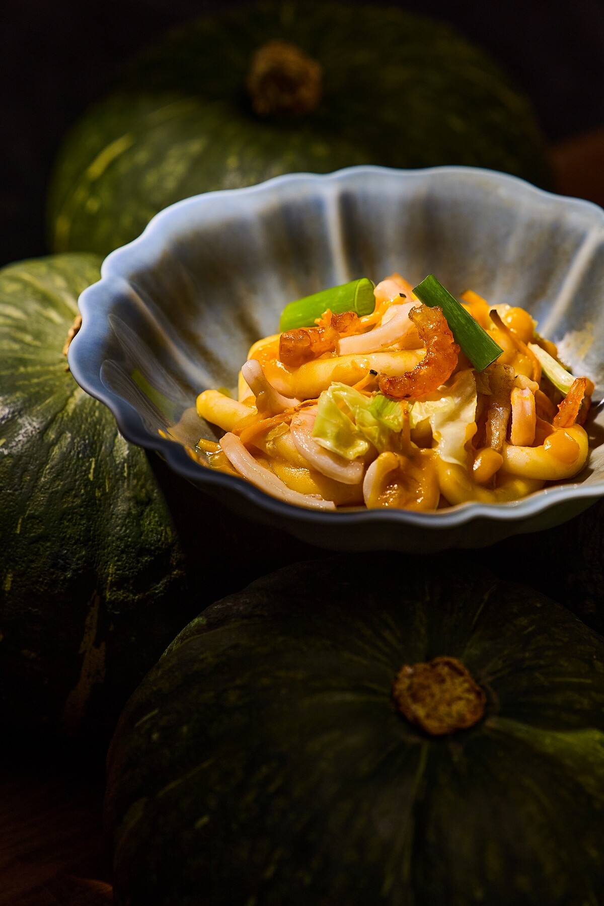 南瓜又稱金瓜,性溫、味甘,用新鮮南瓜製成泥後,加入金瓜絲與爆香過的五花肉絲、中卷絲一同拌炒,再以雞湯調味提鮮,最後加入金瓜絲、高麗菜絲與米苔目吸飽湯汁後,能感受到金瓜自然的甜味與鮮香。