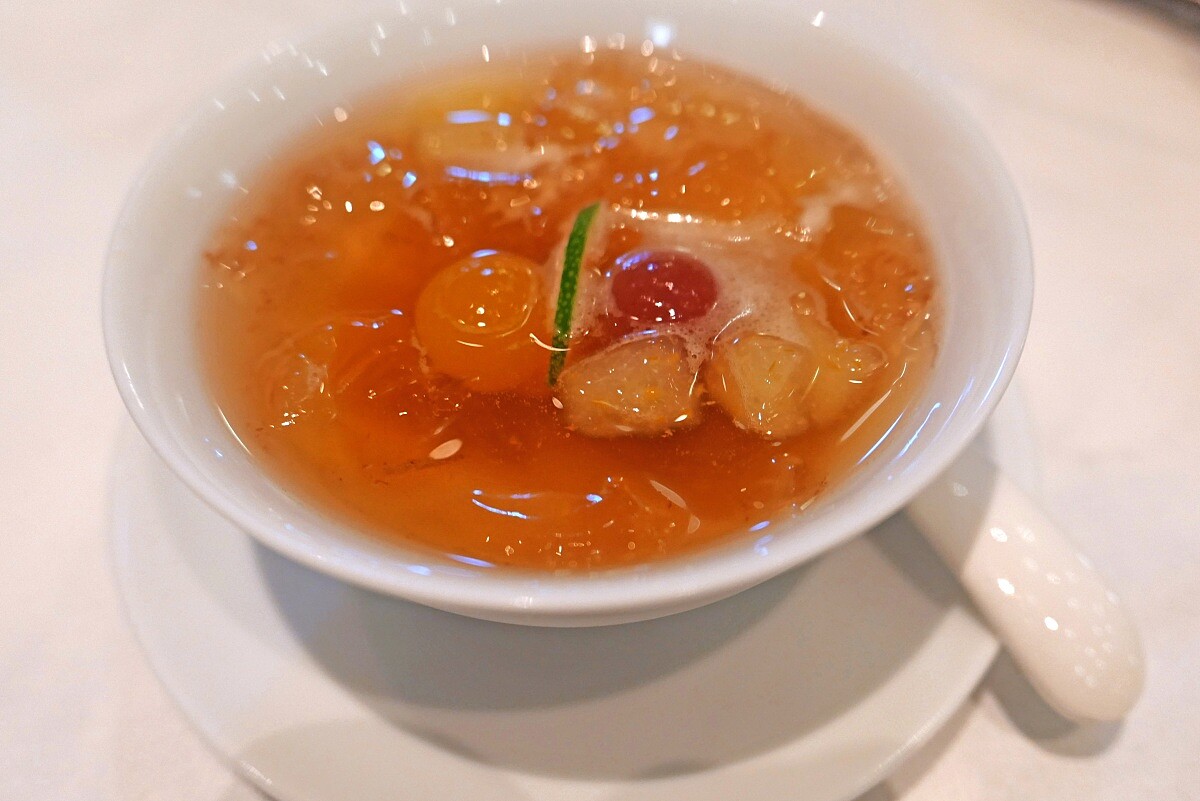 使用的是來自屏東的檸檬,因為屏東是台灣最盛產檸檬的地方,風味特別鮮明。搭配上以冬瓜製成的冬瓜糖漿,偏粉紅色與金黃色的球體,外型像金球,內餡則是不同的驚喜,結合柑橘口味創造出層次豐富的風味。愛玉則是由師傅們手工搓洗製作,保留最純粹的口感,清爽的甜點不僅趣味還具有層次。