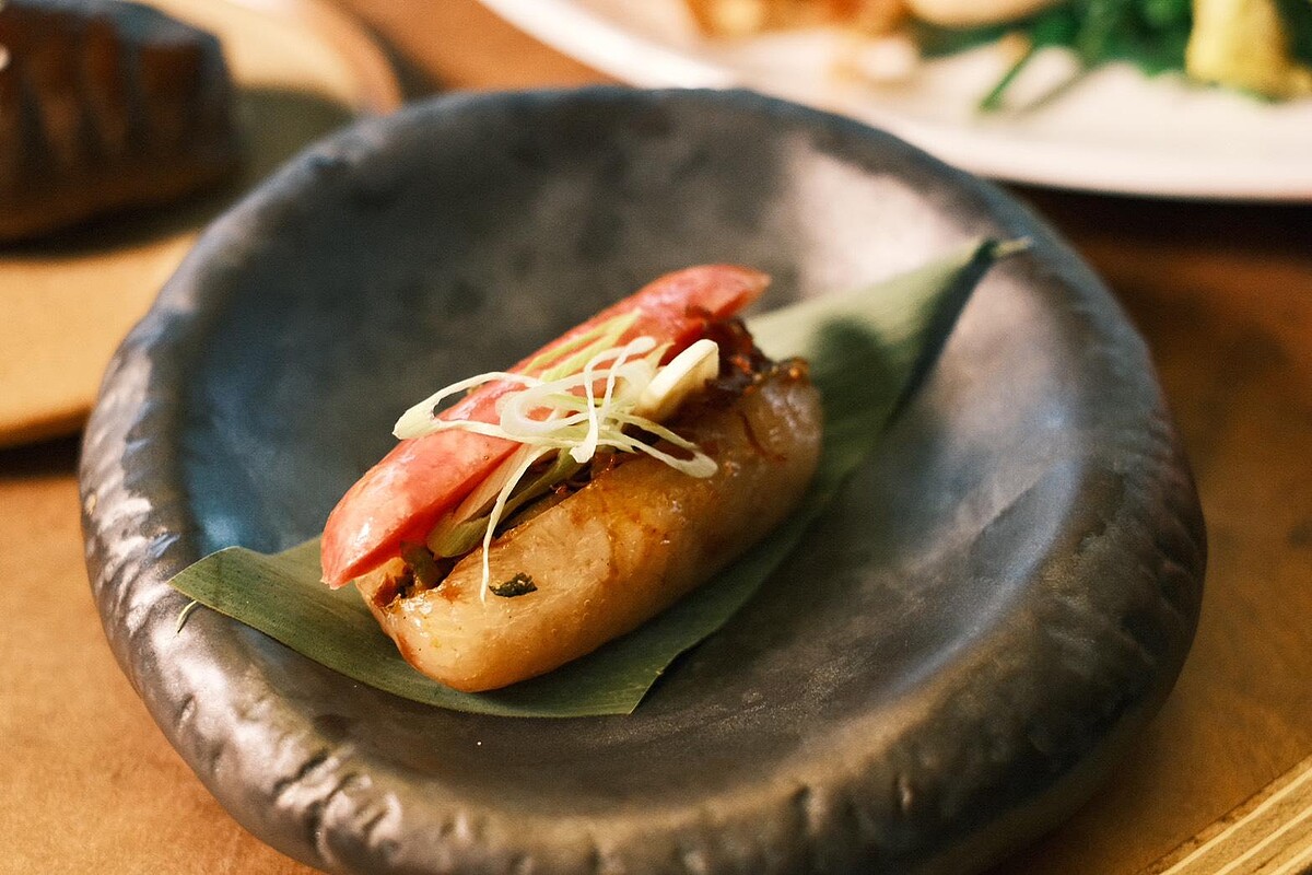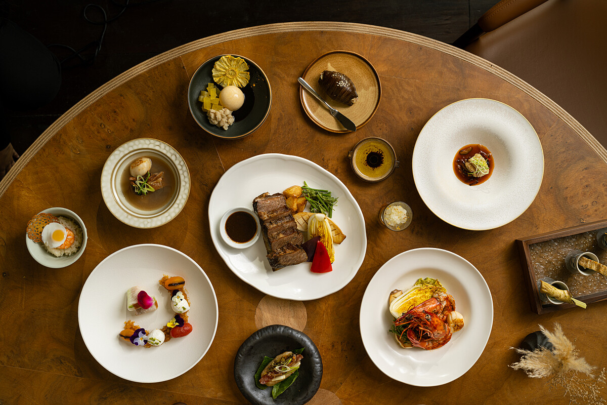 晚餐套餐每位2680元起,主打餐酒辦桌概念,將傳統台菜重新解構再組合,展現辦桌的熱鬧與精緻。像是「三元及第」用杏鮑菇、雞腿肉與炸皮蛋還原三杯風味,「五福臨門」則將傳統五柳枝魚轉為蘋果醋酥炸午仔魚,喜氣又有創意。
