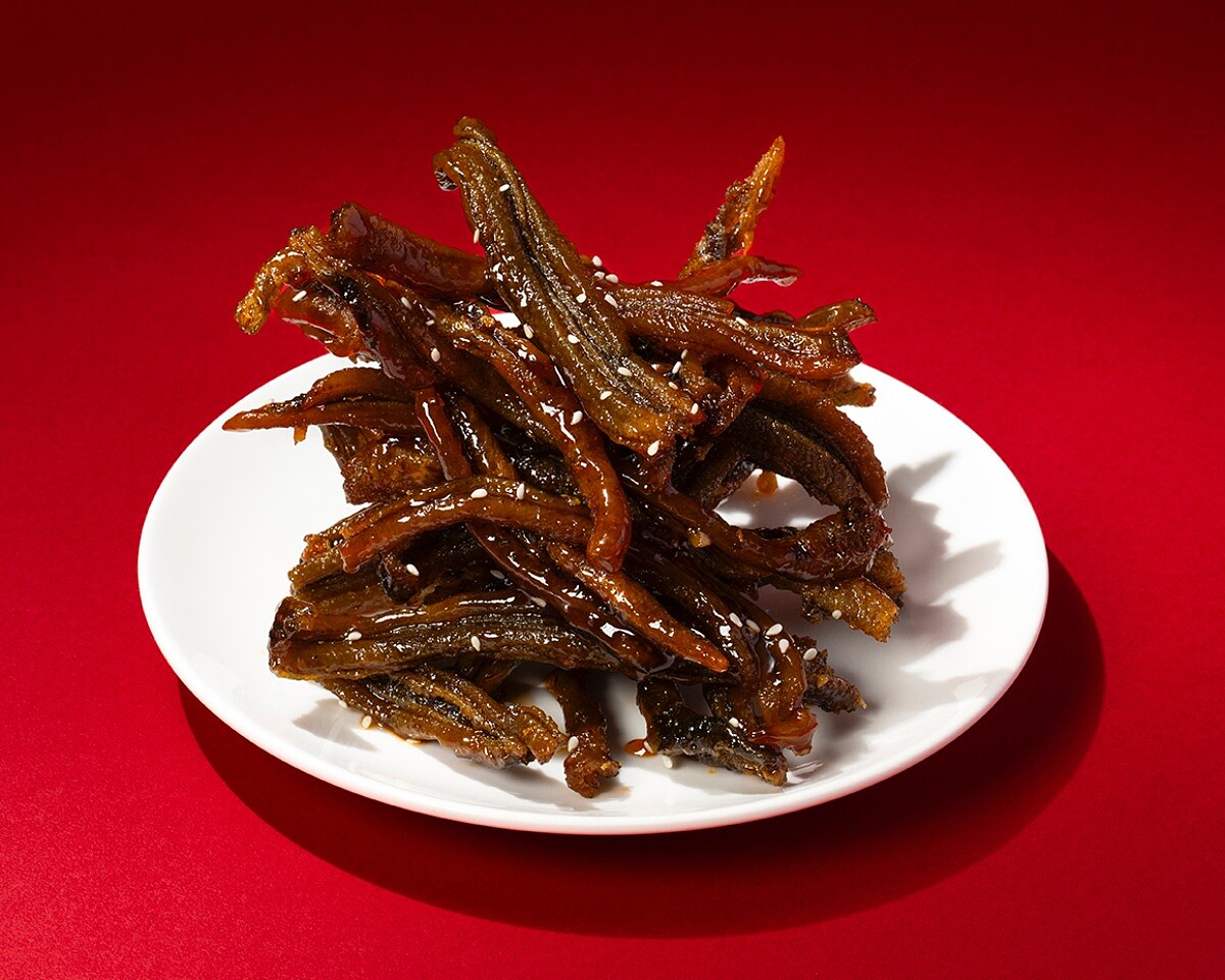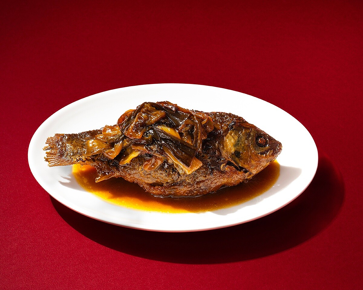 此為傳統江浙名菜,要選用肉質細嫩、刺多而細的鯽魚,這種魚小巧因生長於淡水湖泊與池塘,肉質不僅鮮甜且膠質豐富,素有「小魚之珍」之稱。料理時先以獨家配方醬汁長時間浸潤,使細密魚刺自然軟化,再與大量青蔥一同慢火燉㸆,醬香隨著時間深入魚骨,入口醬色濃郁、魚肉酥嫩,細細咀嚼能感受到微甜回甘的層次,連魚刺都成為入口即化,此道料理是工序繁複的功夫菜。