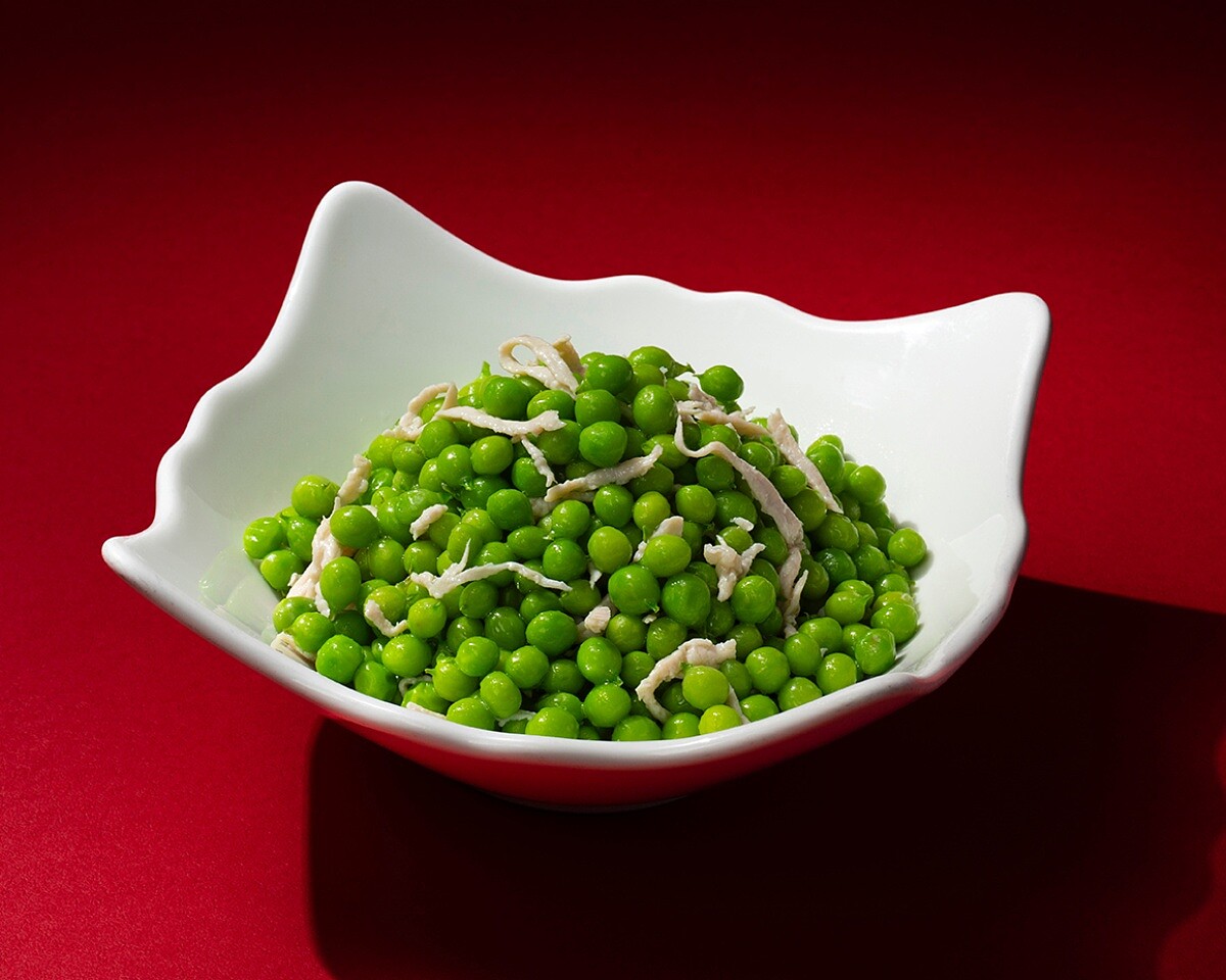 此為風味清雅、口感細膩的江浙經典冷盤,常作為開胃前菜登場,深受各個年齡層的喜愛。以肉質嫩滑的雞胸肉經汆燙後撕成細絲,保持肉質的原始鮮嫩與彈性;搭配新鮮碗豆仁,略加汆煮保留翠綠色澤與自然甜味。調味上以少量高湯、香油、鹽與糖輕拌提味,不過分干擾食材本身的清新本味,反而突顯出雞絲的細嫩與碗豆的甘甜。整道菜色澤素雅、滋味溫潤,是江浙菜講求「清、鮮、雅」的最佳體現。