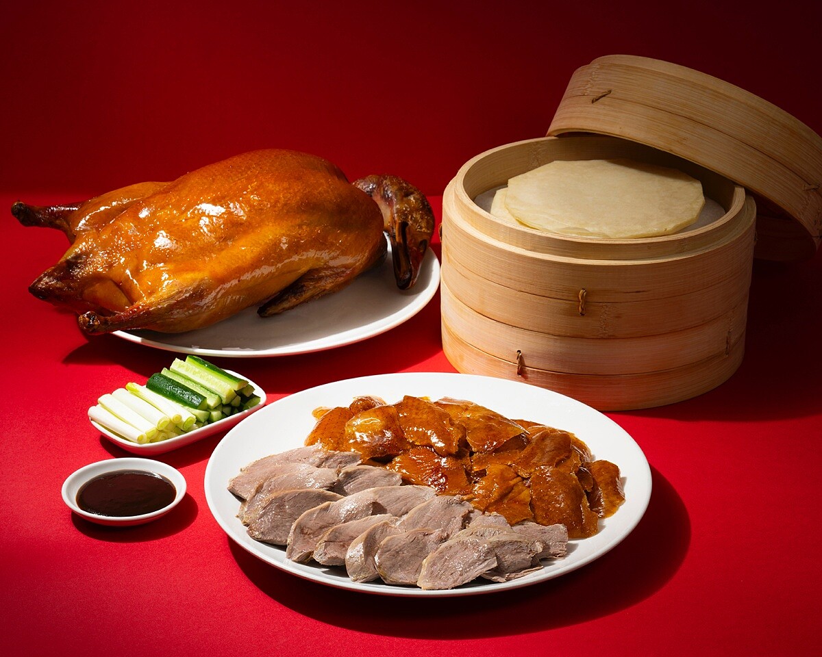 選用肉質鮮嫩、脂肪分布均勻的櫻桃鴨,鴨身飽滿、油脂豐富卻不膩口。以傳統北京烤鴨的工法製作,要先將鴨體風乾,使表皮緊實,再以掛爐方式烘烤至皮酥金黃、油脂微化,片鴨時外皮脆香、內裡柔嫩多汁,層次分明。搭配手工製作的細緻荷葉餅、青蔥、小黃瓜與特調甜麵醬,每一口都是香氣與口感的完美平衡,是一道展現出中式經典菜餚的極致工藝的料理。