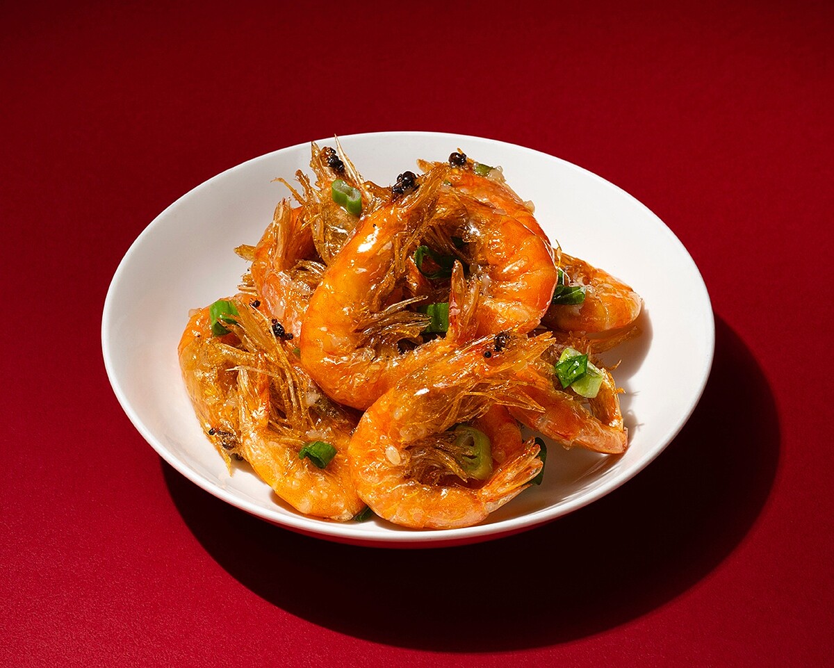 選用鮮活海水蝦,先以熱油快炒至蝦殼微酥、蝦肉鎖住鮮嫩,再加入特製醬油與糯米酒釀翻炒收汁,香氣四溢、色澤誘人。酒釀,又稱醪糟,是以糯米自然發酵而成的傳統調味料,帶有天然米甜與淡淡酒香,不僅能柔化食材腥味,更賦予菜餚獨特的溫潤層次與回甘風味。在這道菜中,酒釀的甜與蝦的鮮相輔相成,提升整體香氣與口感層次,鹹香中透出一抹柔和酒韻,讓人回味無窮。