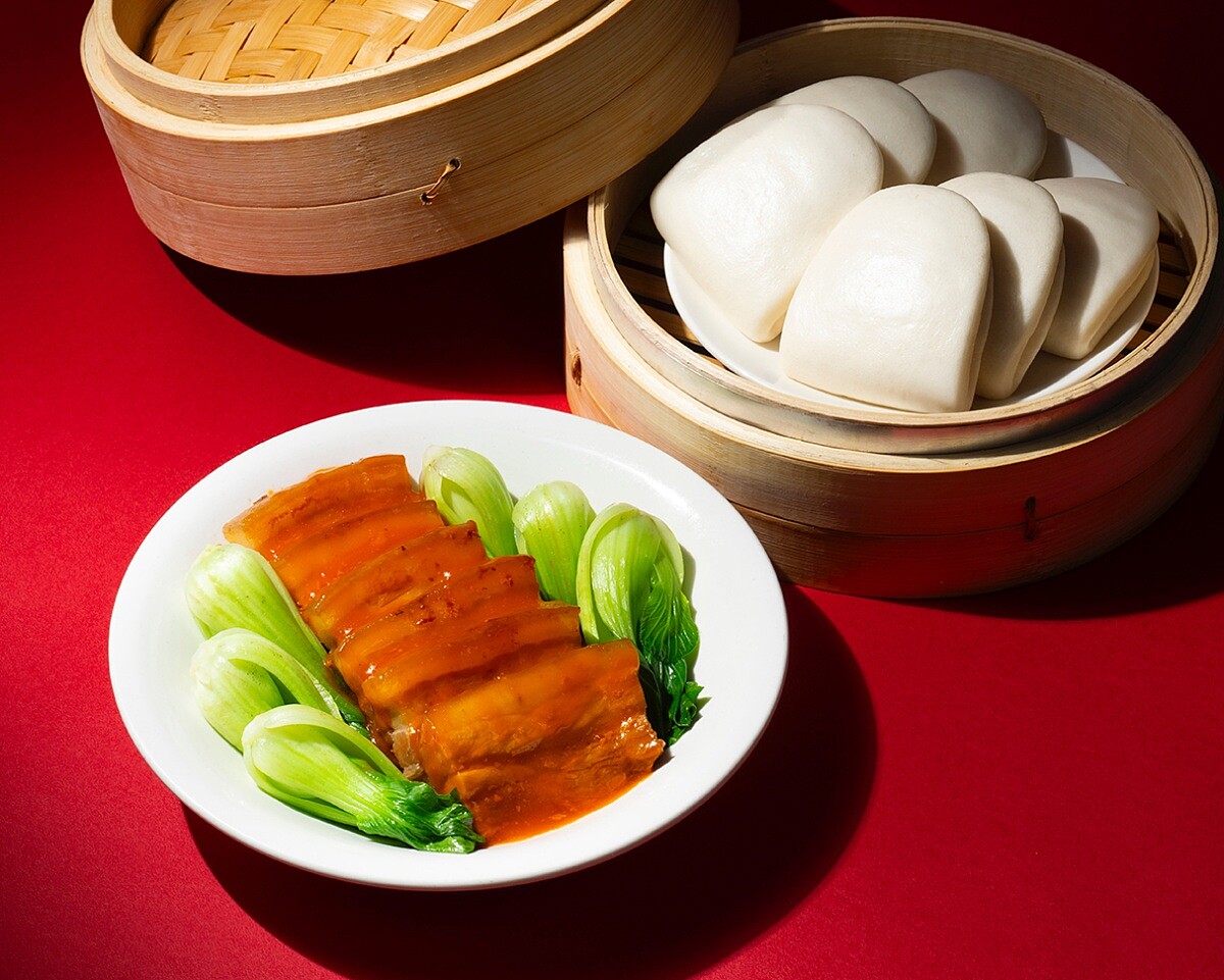 選用油花分布均勻的溫體五花肉排,搭配獨家調配的紅糟與豆腐乳醬汁細火慢燉,並加入米酒提香,讓醬香滲透入肉,燉至軟嫩入味、肥而不膩。 腐乳,是以豆腐經鹽漬與發酵後形成的發酵豆製品,風味濃厚、鹹香帶甘,經過時間熟成後更帶有一種特有的酒香與醬香,常被譽為中式「起司」。在這道料理中,腐乳不只是調味,更是靈魂所在,讓整體滋味醇厚濃郁、香氣深邃。搭配手工荷葉餅入口,將五花肉的油潤與腐乳的鹹香巧妙中和,咀嚼之間層次疊現,是一道既豪氣又細膩的經典菜。
