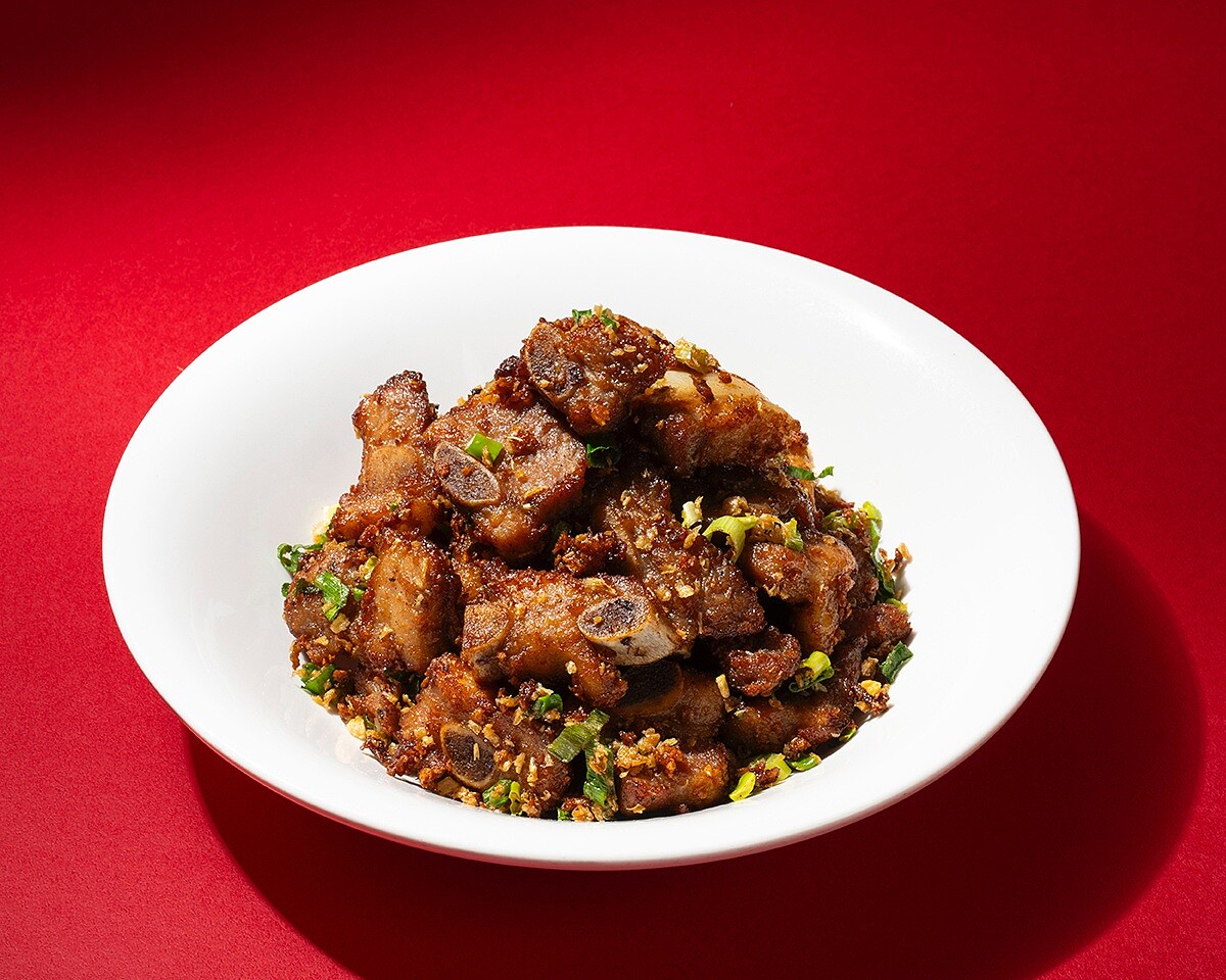 選用油脂分布均勻的豬腩排,先以大量新鮮蒜頭醃漬入味,再低溫冷藏靜置,讓蒜香徹底滲入肉質。下鍋前以高溫油炸,將表皮炸至金黃酥脆,外酥內嫩、香氣四溢。起鍋後再與爆香蒜酥拌炒,讓整體風味更上一層。每一口都能感受到香酥蒜粒與多汁子排交織出的濃烈香氣,層層堆疊,酥香鹹香兼備。