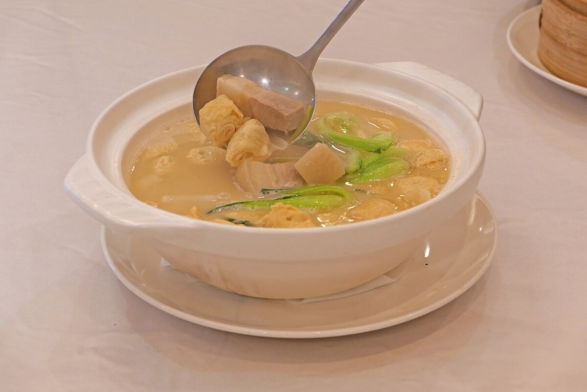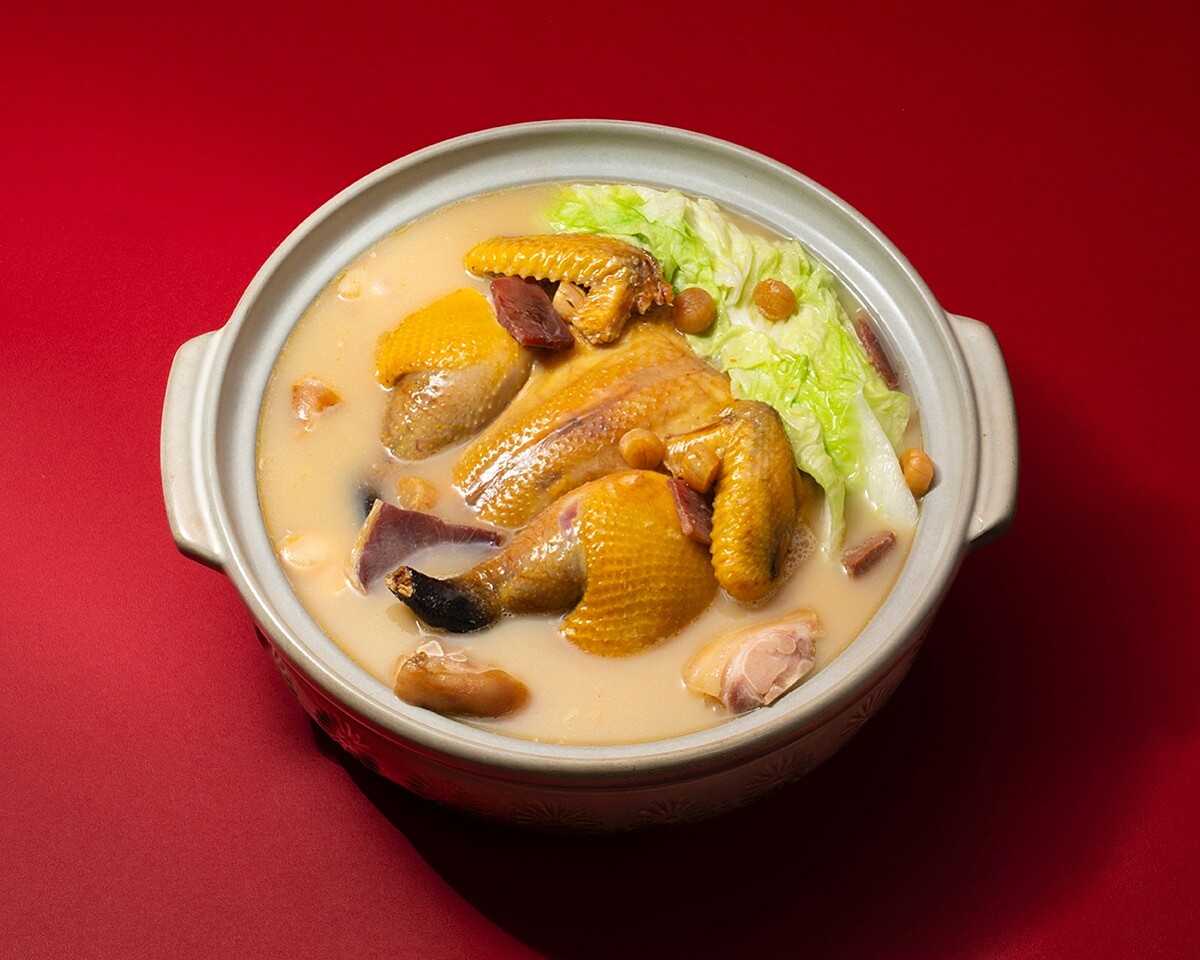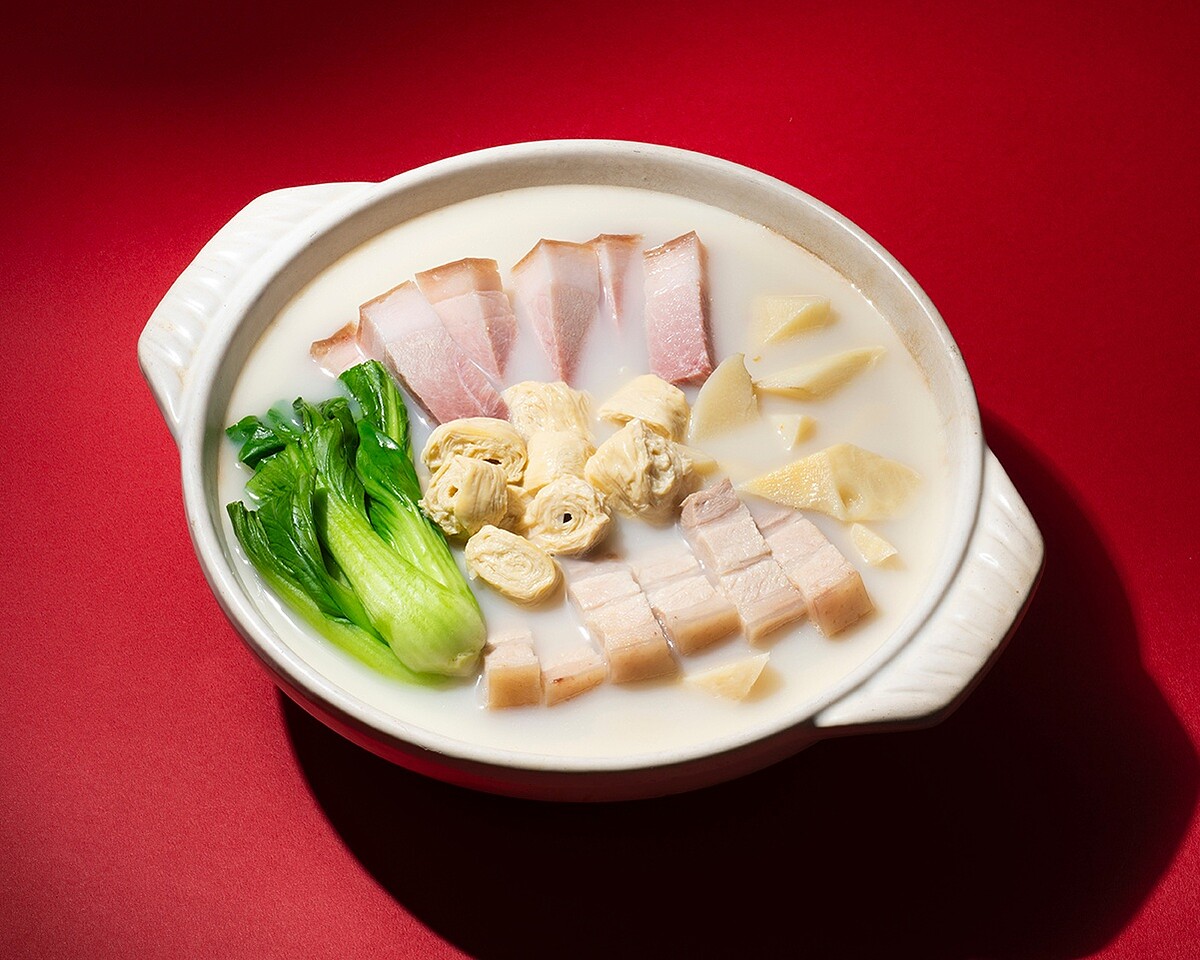 「春申食府」的版本以30小時精熬的老母雞白湯為底,搭配家鄉肉、常溫五花肉與春季嫩筍,文火慢燉,使湯色乳白細緻、層次豐盈。特別選用風味較淡的家鄉肉取代傳統重鹹火腿,使湯頭更加清雅甘醇。並以豆腸取代豆腐結,口感滑順柔嫩,更能吸附湯汁的香氣。每一口都是歲月與技藝交織出的溫柔,喝來清甜不膩,餘韻悠長,恰如江南人家的細水長流。
